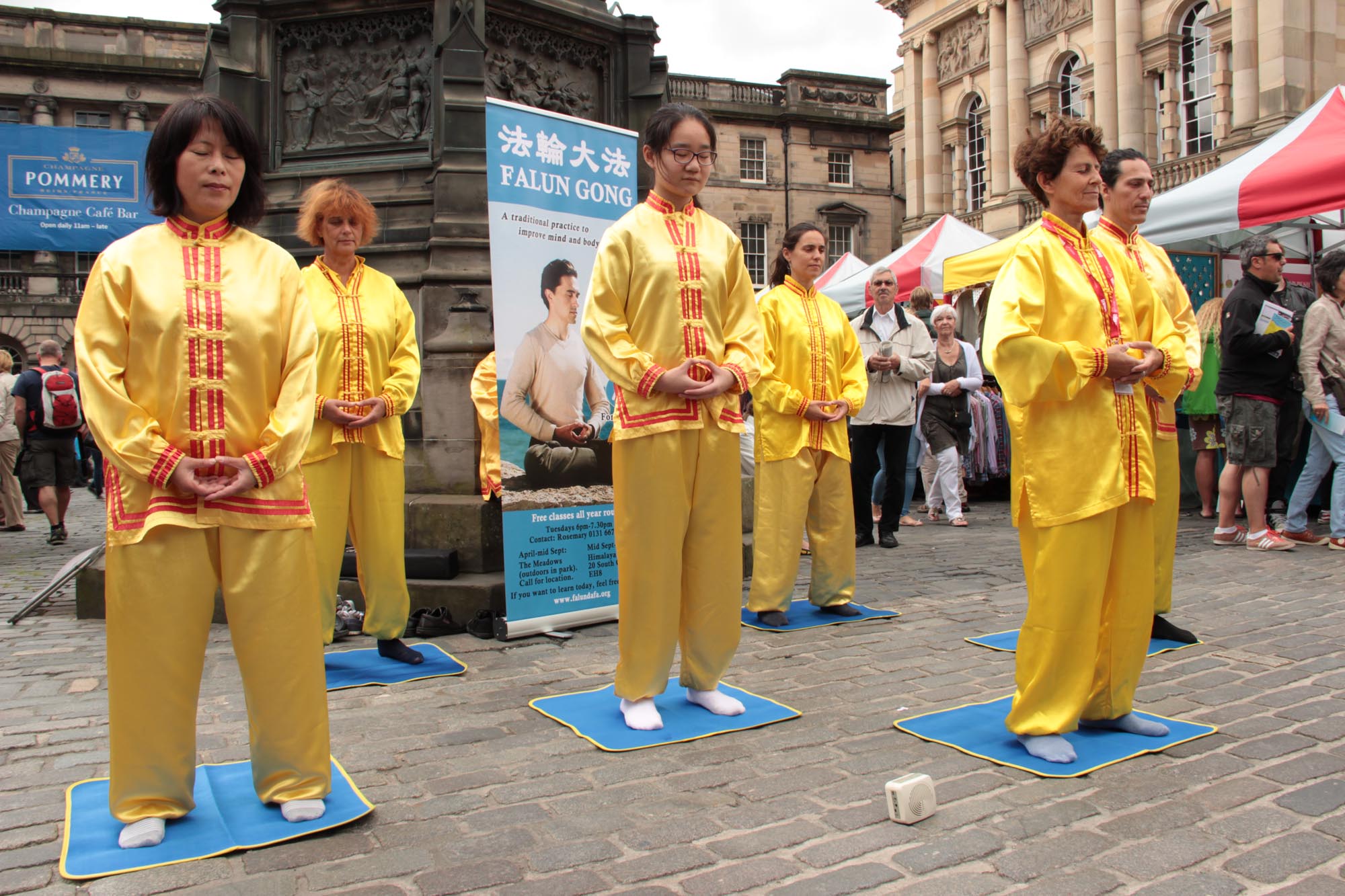 皇家大道(Royal Mile)是各国和英国各地旅游者去参观爱丁堡城堡的必经之路。为了让更多的人们知道法轮大法的美好,让可贵的中国游客们知道真相,来自苏格兰、英格兰的一些法轮功学员连续两个周末在艺穗节上展示法轮功功法,派发介绍法轮大法的传单。
