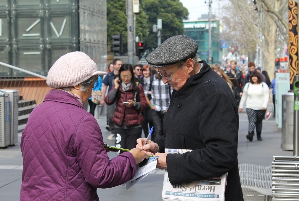 【明慧网二零一四年八月二十六日】(明慧记者夏纯清墨尔本报导)二零一四年八月二十三日,墨尔本晴朗的周末,和煦的阳光带来了春天的活力,感染着市民和游客,熙熙攘攘的人群让常年坚守在市中心“城市广场”讲真相的法轮功学员格外忙碌,期间接待了很多来自中国的游客。