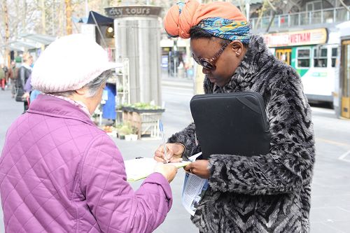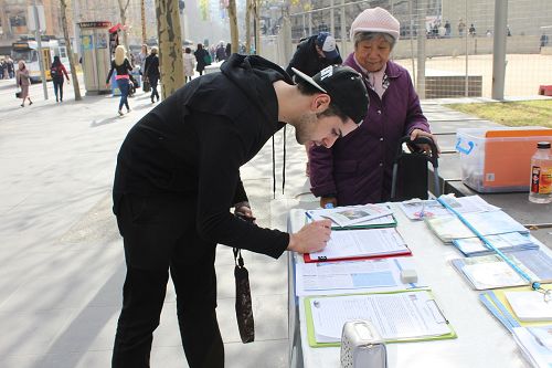 来自香港的留学生小黄(Chuff Wong)在墨尔本大学就读,在呼吁制止迫害法轮功的征签表上签名之后,和学员交谈了很久,因为一开始很怀疑“活摘器官”指控的真实性,所以问了很多问题,学员一一做了回答,最后他沉痛的说:“必须立即制止这一切。”