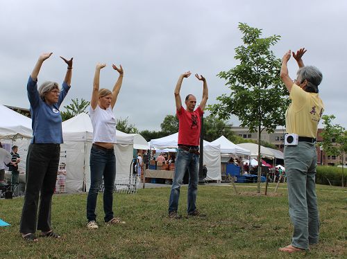 二零一四年八月二日,第三十四届布莱克斯堡民俗艺术节在城镇中心的商业街举行。介绍法轮功的展台吸引了许多人驻足观看五套功法展示,一些游客当场学了起来。