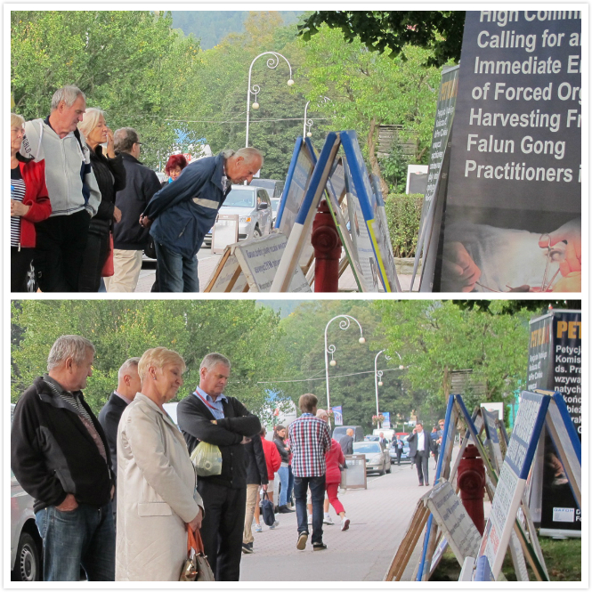 波兰法轮功学员在开幕的当天也来到克雷尼察茲德魯伊,其中一名法轮功学员在会场里讲真相、发《九评》,而其余学员都在会议代表们出入的主要街道上摆放展板,向当地市民、过往游客和各国参会代表讲真相,广发法轮功真相传单,征签反对中共强摘法轮功学员器官的罪行。法轮功学员为此准备了波、英双语征签表,中、波、英三语展板并准备了十多个语种的法轮功真相传单。