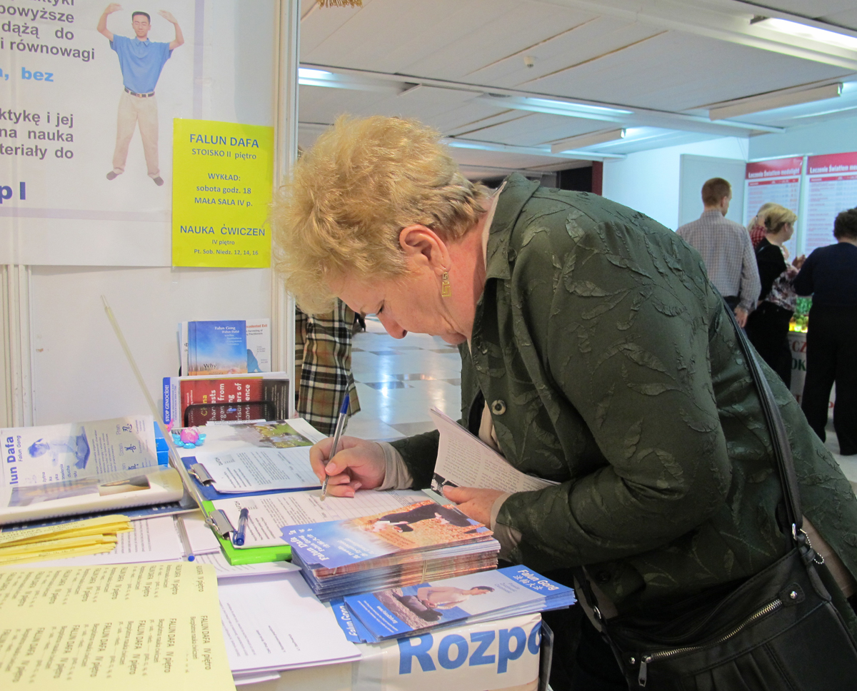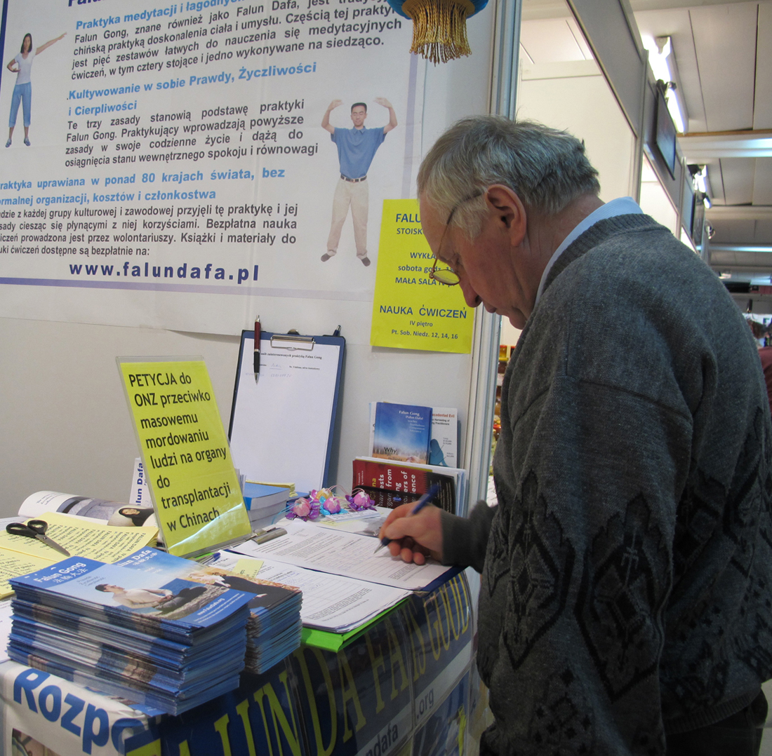 HERICH PAWEŁ先生是位七十四岁的老人,原来身患多种重疾,一侧肾也被切除了,疾病的折磨促使他到处寻医问药,是各种健康博览会上的常客。一年前,在卡托维兹博览会上他学习了法轮功,当时感觉很好,就买了一张教功光碟回家后坚持炼功。可是第五套功法他没学会,腿有病又不能打弯,所以就只炼一至四套功法,即使这样,他说每次炼功都会感到强大的能量,人感到精力非常充沛,慢慢地药也不用吃了,还时常有一些神奇的事发生。春季博览会上,老先生专程过来学习第五套功法,并要求购买《转法轮》,说一定要看这本书,法轮功太好了。他自豪地给法轮功学员展示学会的一至四套功法,看到他熟练的动作,法轮功学员都开心地笑了。临走时,他郑重地在反对中共活摘法轮功学员器官的征签簿上写下自己的名字。