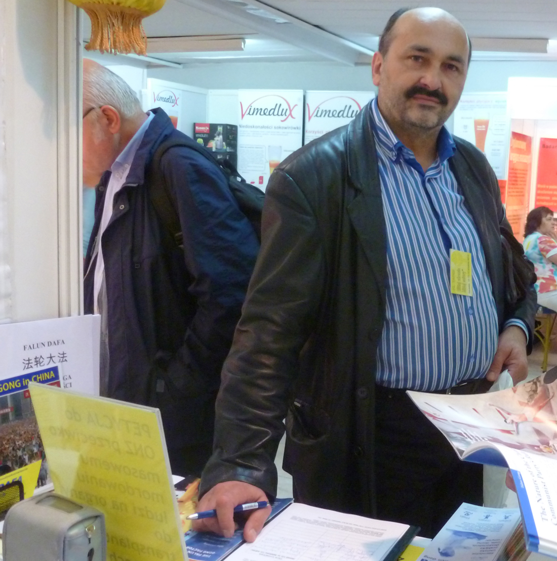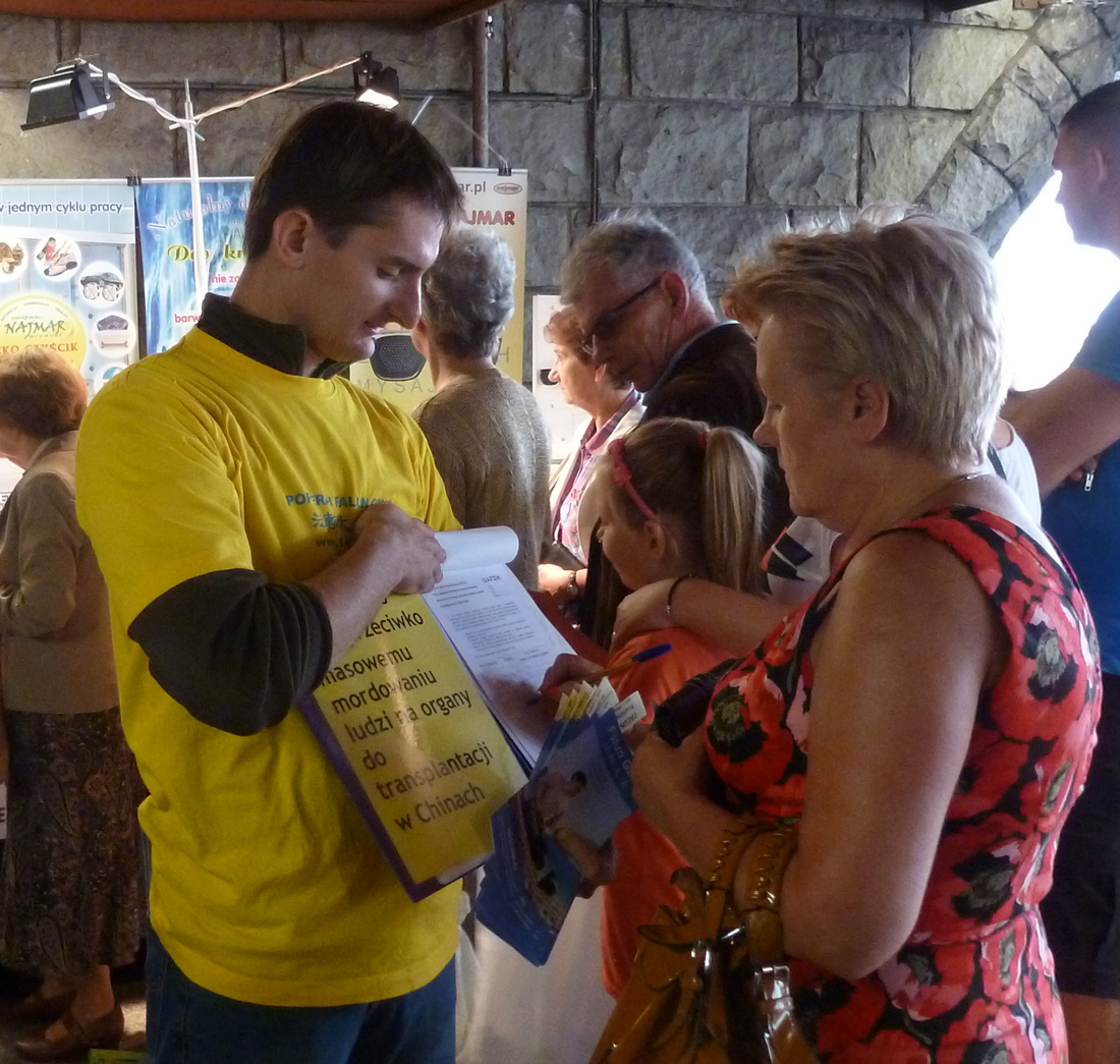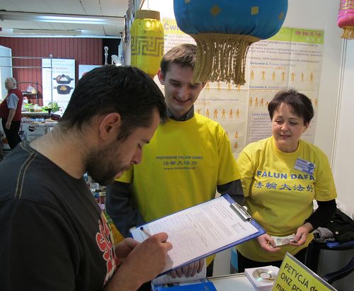 波兰的瑜伽师 Mariusz Cicirko先生在秋季博览会上专程找到法轮大法展位,在反对中共活摘器官的征签簿上郑重签下自己的名字。