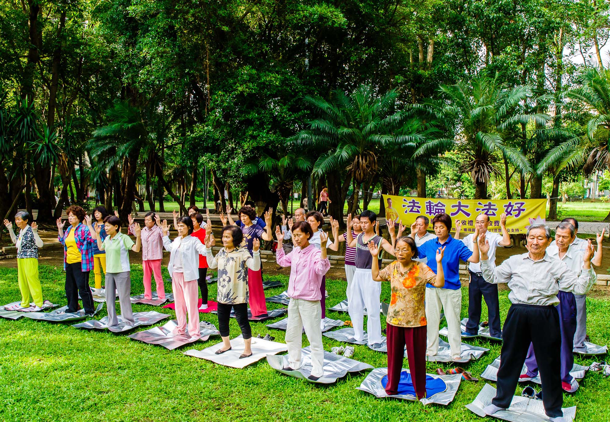 在台南东宁公园中央大草地上,清晨人们总会听到悠扬祥和的炼功音乐,法轮功学员在此集体炼功。