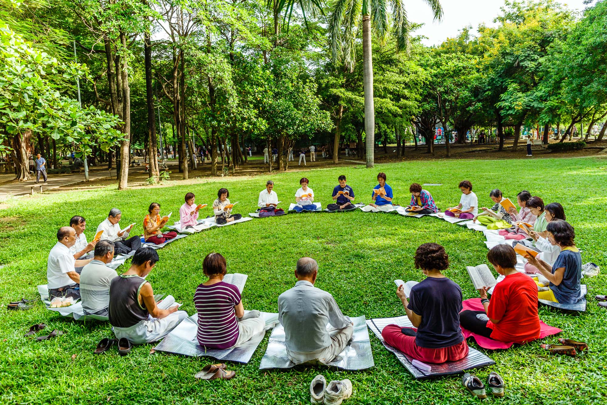 在台南东宁公园中央大草地上,法轮功学员炼完五套功法后,继续一起学法一个半小时。