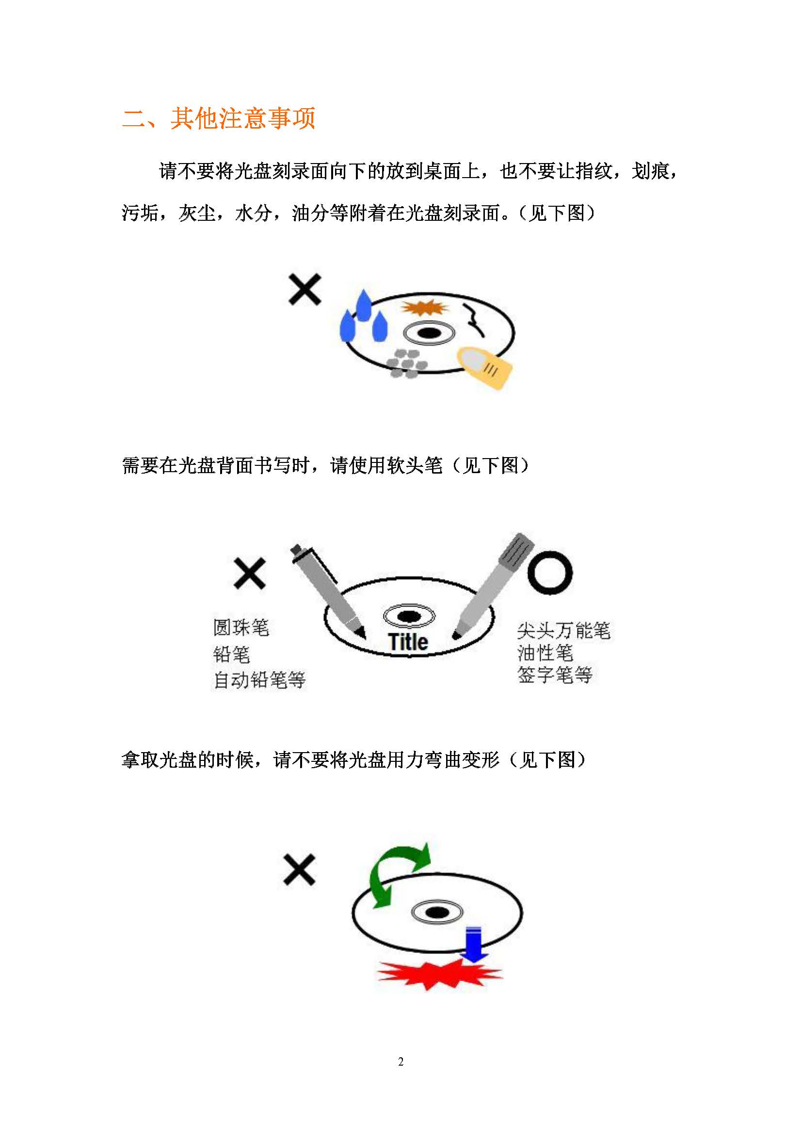 拿取光盘的时候需要注意一些事项,比如不要将光盘刻录面向下的放到桌面上,也不要让指纹,划痕,污垢,灰尘,水分,油分等附着在光盘刻录面,因为 留在盘片上的划痕、污垢、指印等可能会导致光驱无法正确读取数据。