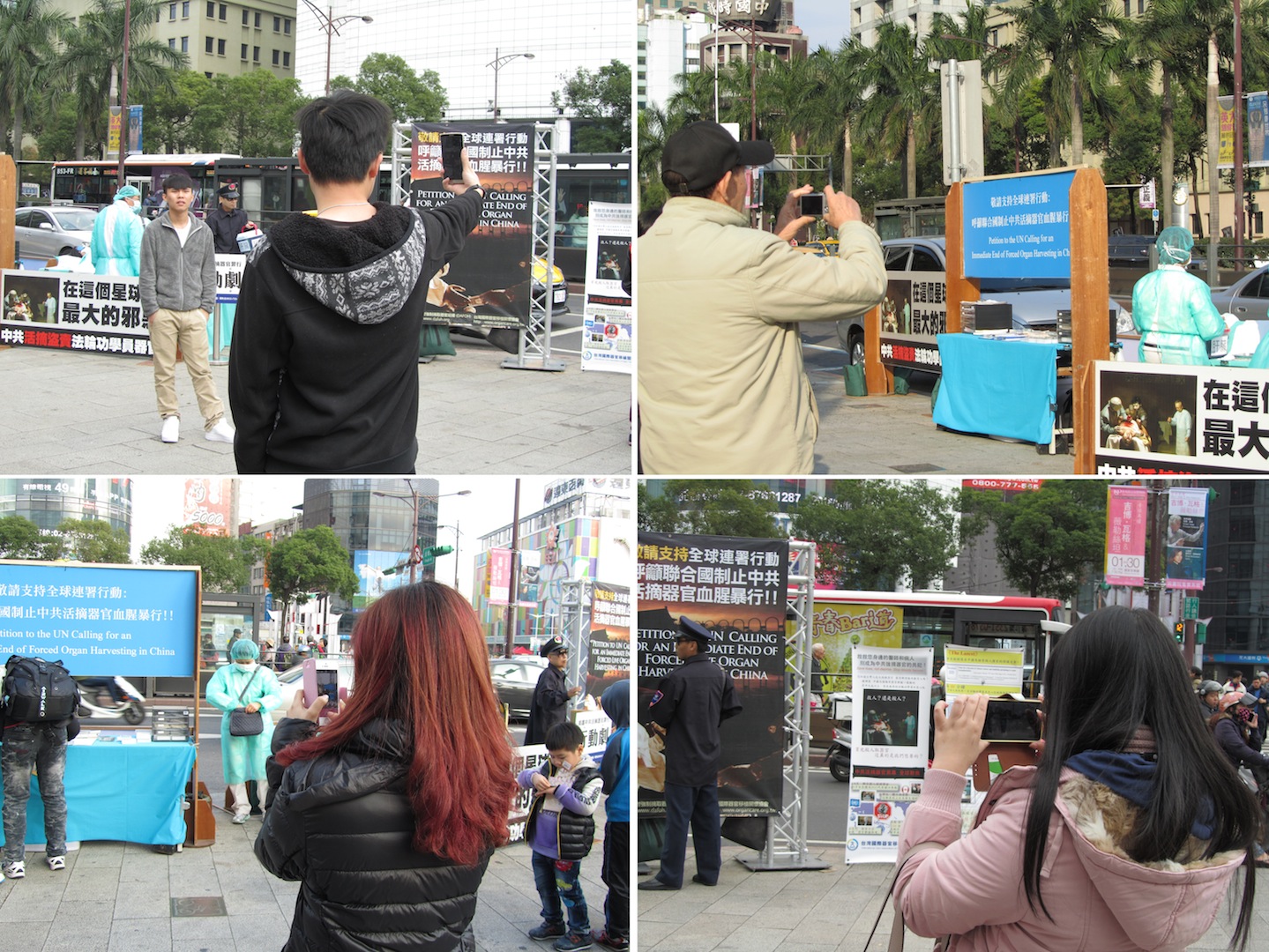 法轮功真相展板鲜明的诉求和演示行动剧,吸引各类型车上乘客、摩托车骑士、熙来攘往的中西游客,以及行车道中间的候车亭上的民众引颈关注,他们驻足观看并且纷纷签名支持正义,呼吁制止中共的血腥暴行。有的拿取真相资料认真阅读,不少人拿起手机、相机拍摄画面,有的拍照后立即将这讯息传送出去或上网周知。一群群的中国大陆游客聚在演示剧前方十来步远的距离,望着场内的真相演示,耳听法轮功学员惠雯用随身麦克风说明真相。