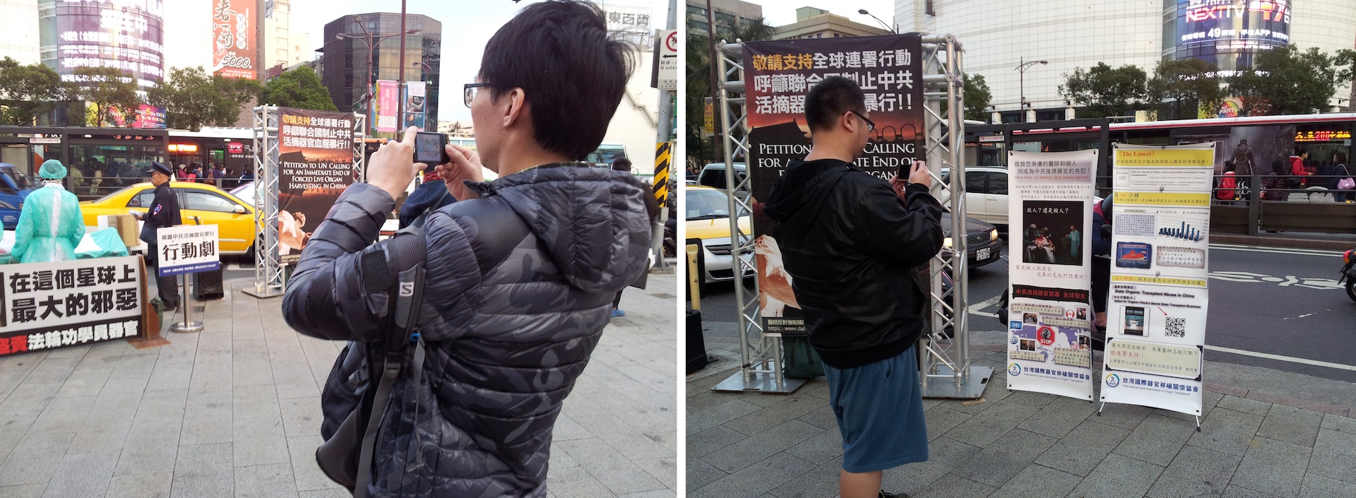 ![]() 图2-3:“中共活摘法轮功学员器官”模拟演示行动剧吸引车上乘客、摩托车骑士以及熙来攘往的民众聚焦注目。 |
