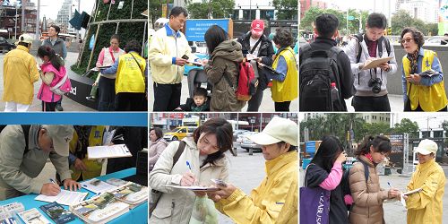 许多人签名后向法轮功学员道谢,一些旅客表明自己是大陆人,不方便签名,但是很支持这样的活动,他们对学员说:“很支持你们法轮功,你们要多加油! ”
