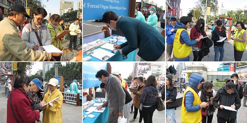 来自台中的兽医师贺女士,特地把轿车停在路旁,下车来签名,她说早知道中共活摘人体器官的事情,呼吁制止迫害是应该做的好事,她非常支持。台北的郭医师问学员:“这是民间做的吗?”“不,这是中共做的。”郭医师二话不问,向学员要笔,在联署表上签了名。
