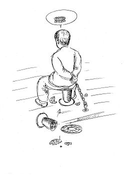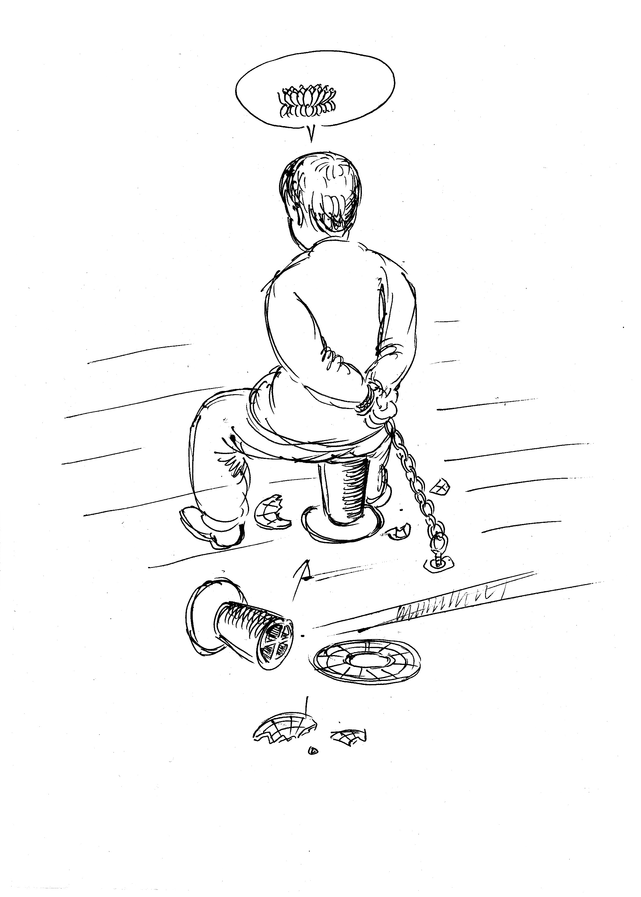 双手反铐,手铐上再拉上铁链子锁在地面木板上。线圈座子直径只有20cm,并故意敲碎上面圆盘,只剩下9cm直径柱芯,逼迫法轮功学员长时间坐着面壁。