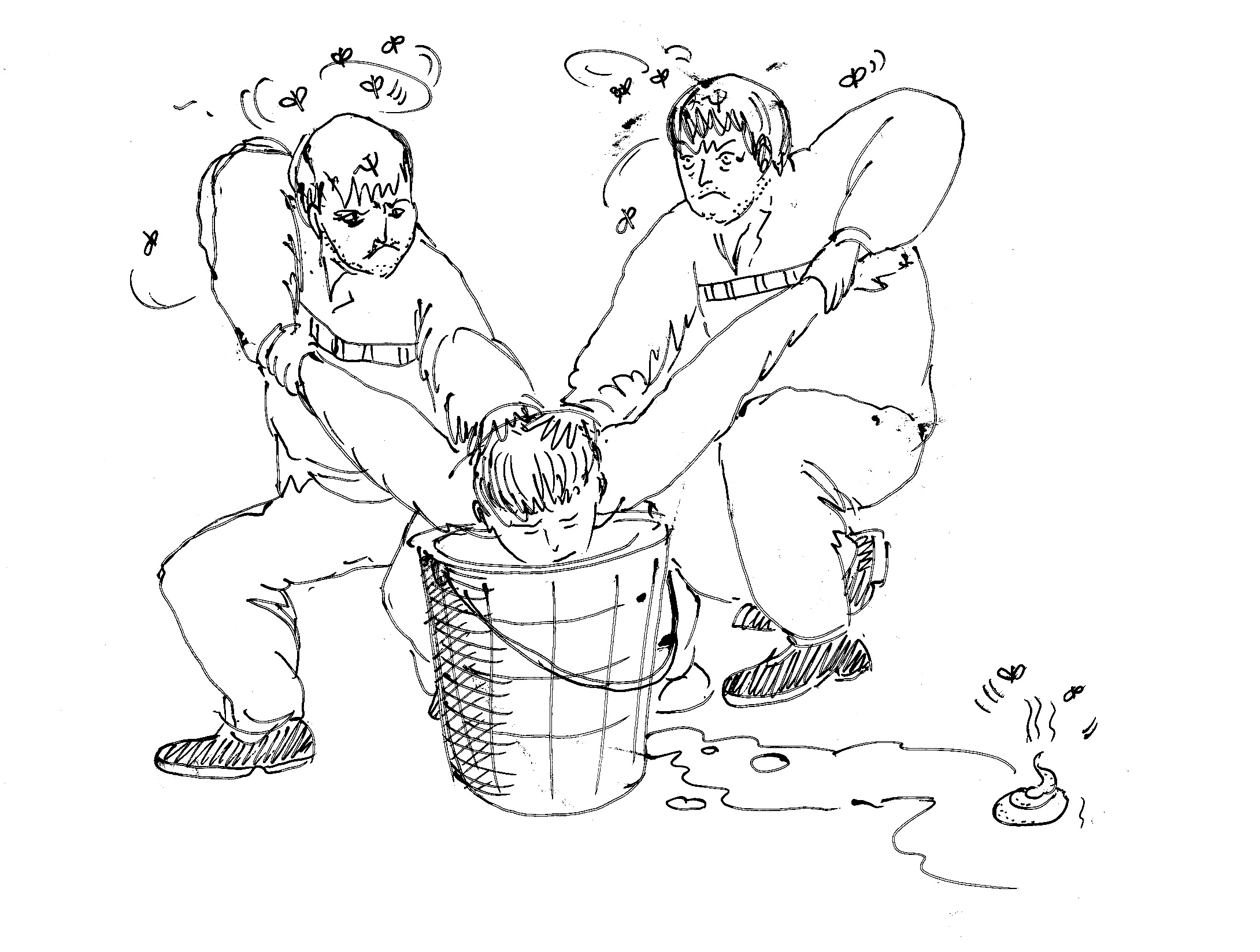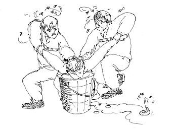 二犯人将法轮功学员头强行摁入粪桶。