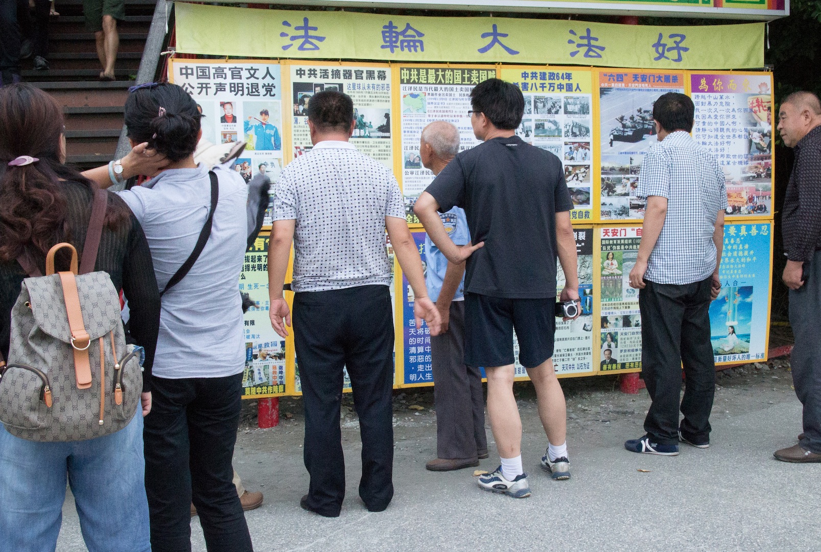 在西子湾“法轮大法好”的真相墙很吸引大陆游客驻足观看,一位先生说:“这些都是在大陆看不到的真相。”
