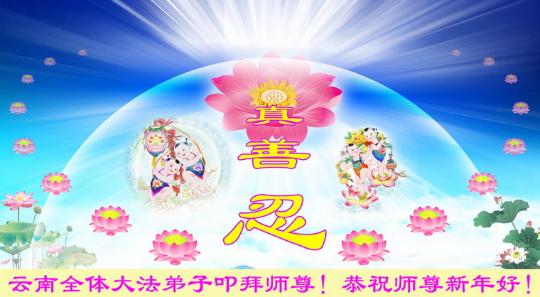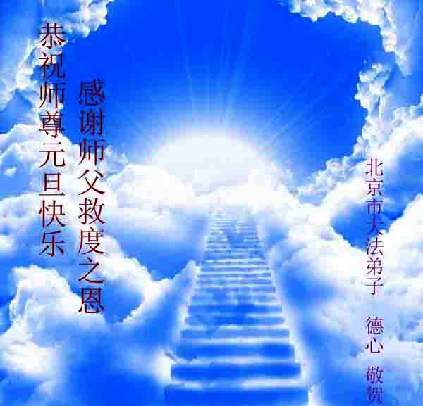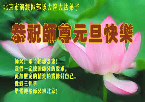 慈悲伟大的师父:您好!北京师范大学大法弟子跪拜师尊向师父拜贺新年!2015年的到来,历史的大幕又将拉开新的乐章。能成为主佛的弟子,能肩负助师的重担,能成为这场历史大戏的主角,是我们生命永远的荣耀。作为中国教育系统的高校教师,我们面对着特殊的师生群体,如何在高知群体中破除思想禁锢,救度更多的人,唤醒他们的本性,如何去掉怕心,都对我们自身的修炼和救度众生提出了更高的要求。回首过往,还有太多的不足和遗憾,尚有太多的众生没有被救度,深感痛心疾首。19年修炼路,岁月更替,时空变幻,历经种种阻挠与考验,始终不改的是随师正法的心,感谢师父一路看护、加持与点化!感谢师父为宇宙所有众生的操劳与付出!我们北京师范大学大法弟子一定会坚定信心,修好自己,抓紧救人,放下名、利、情,请师父放心。全体北京师范大学大法弟子跪拜师父,再拜师父:师父新年好!