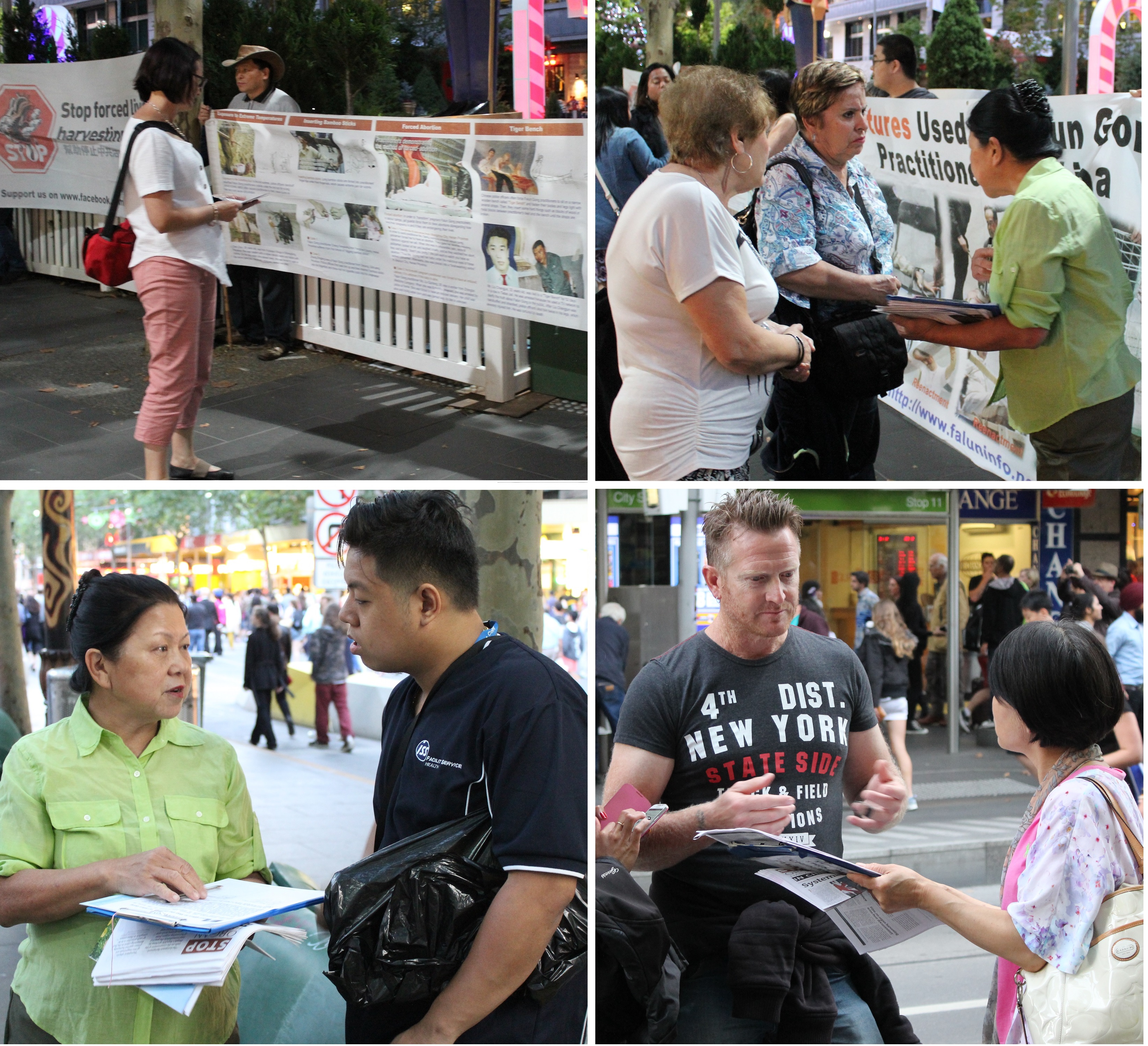 位于市中心的城市广场是无数游客的必经之处,晚上六点开始,墨尔本部份法轮功学员一如既往的拉起横幅,挂起展板,向过往的民众展示祥和优美的五套功法、讲清法轮功反迫害的真相以及中共活摘器官的惊天罪恶。在喧闹的庆典中,展现出和平坚忍的风貌。