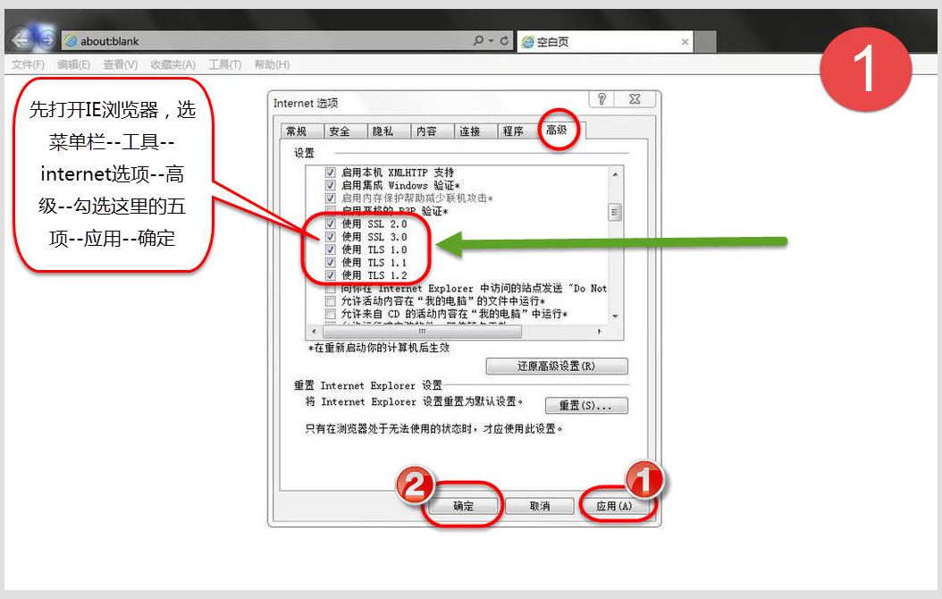 一、首先在常人系统对IE浏览器进行举报前的必要设置:打开IE,打开菜单栏--工具--internet选项--高级--勾选ssl2.0,ssl3.0(由于网站使用特殊的协议,不勾选就打不开举报网页)--应用--确定。