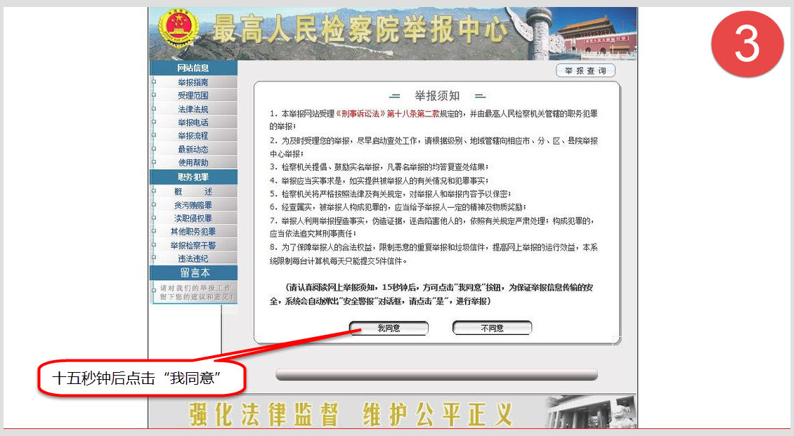 三、在“举报须知”网页,等十五秒钟后,点击“我同意”。