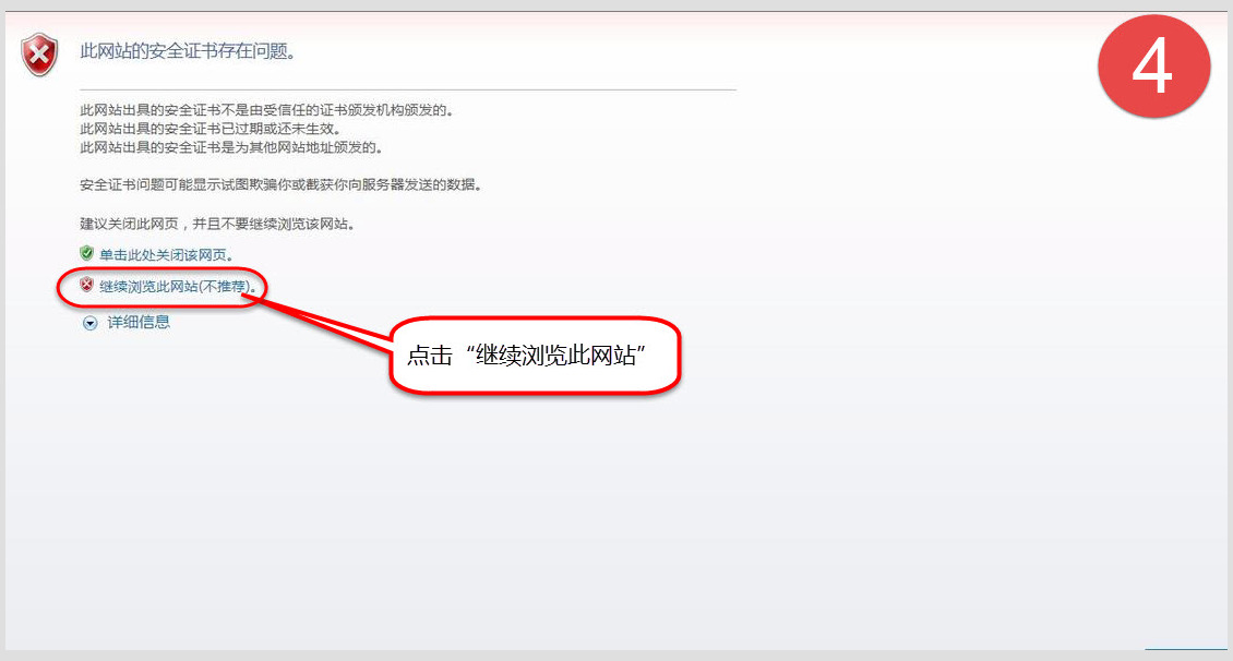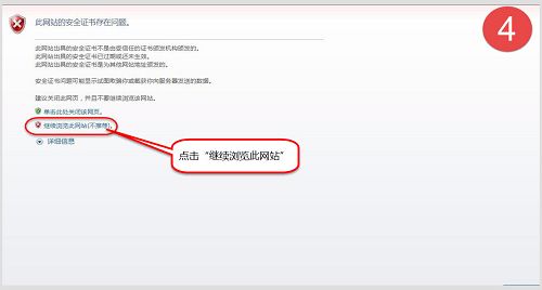 四、出现“此网站的安全证书存在问题”,不用理睬,点击下面的“继续浏览此网页(不推荐)”继续进入。