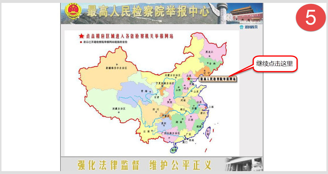 五、出现中国地图,点击“最高人民检察院举报网站”提示图标。