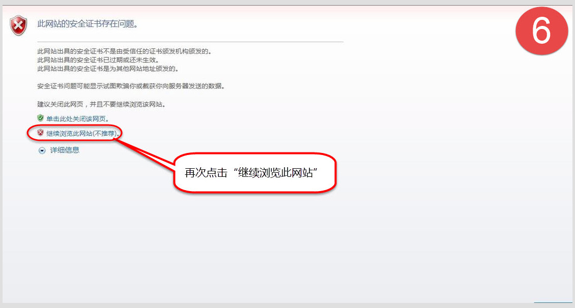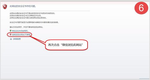 六、又出现“此网站的安全证书存在问题”,不用理睬,再次点击下面的“继续浏览此网页(不推荐)”继续进入。