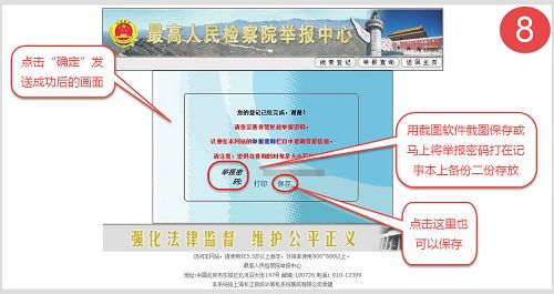八、发送成功!出现“你的登记已经完成,谢谢!”及举报号码,用系统自带的截图软件截图保存备份二份到不同的加密盘中,以便日后查询,把截图画面的举报号码马上抄写在记事本上保存(注意大小写),或者点击网页上面的保存按钮进行保存。