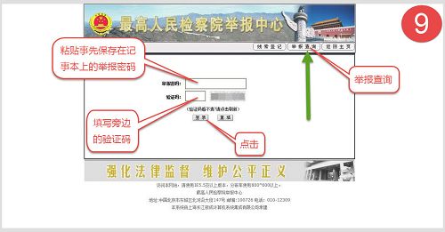 九、点击网站上面的“举报查询”按钮,把记事本保存的查询号码粘贴到“举报密码窗口”,填写旁边提供的验证码,点击“登陆”按钮。