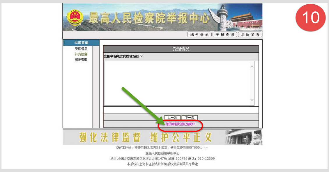 十、出现受理情况窗口,一般马上就可以看到窗口下边的“你的举报线索已接受!”然后可以到明慧邮箱登记诉江备案,过几天(一般为七天)可以再查询一下受理情况。