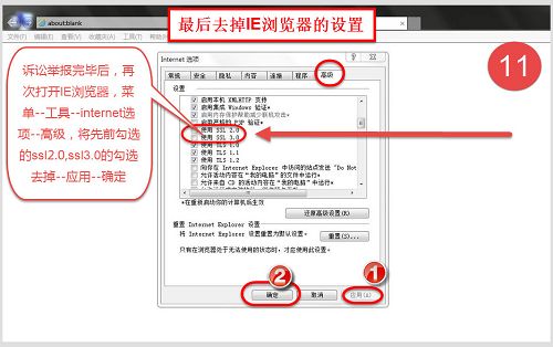 十一、完毕后不要忘记马上把先前的IE浏览器的设置还原,打开IE--菜单栏--工具--internet选项--高级--把ssl2.0,ssl3.0前面的小勾去掉--应用--确定。