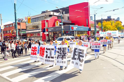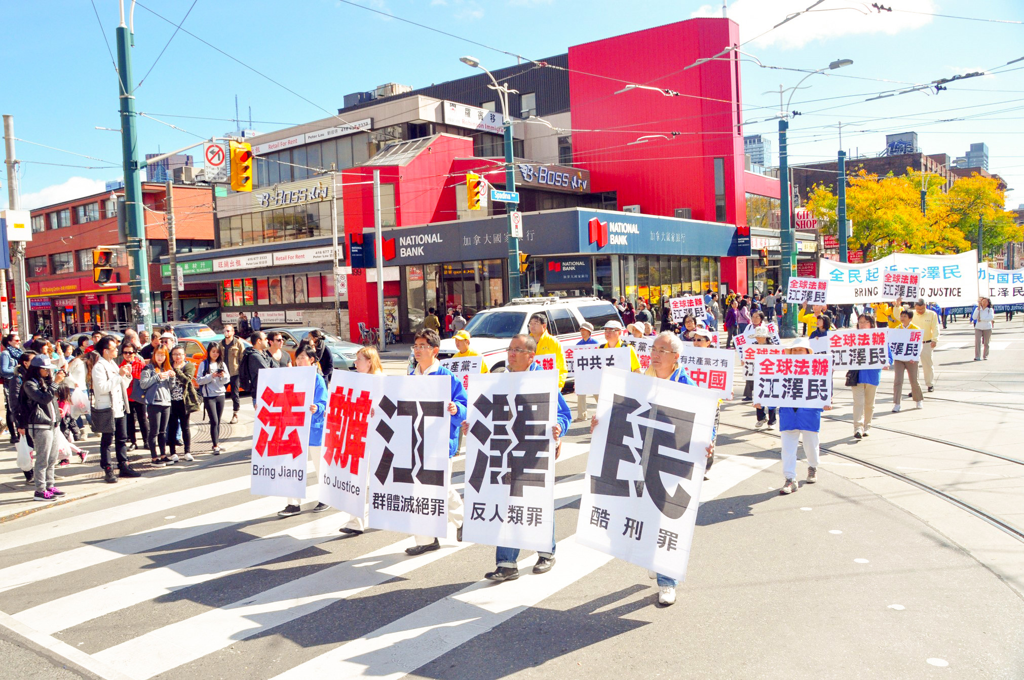 多伦多的Ali 和Kevin看完游行并拍了照,看着远去的队伍还在议论着,Ali说:“我有一个在阿尔伯塔省(Alberta)的中国朋友,她是一位法轮功学员。她在脸书上给我介绍了法轮功的真相,她在中国时也受过迫害,所以我知道法轮功真相。今天的游行很有意义,把刽子手江的名字公布出来,让更多人知道,如果到google上一搜索,他的什么罪行都可以看到了,共同把元凶送上审判台。”