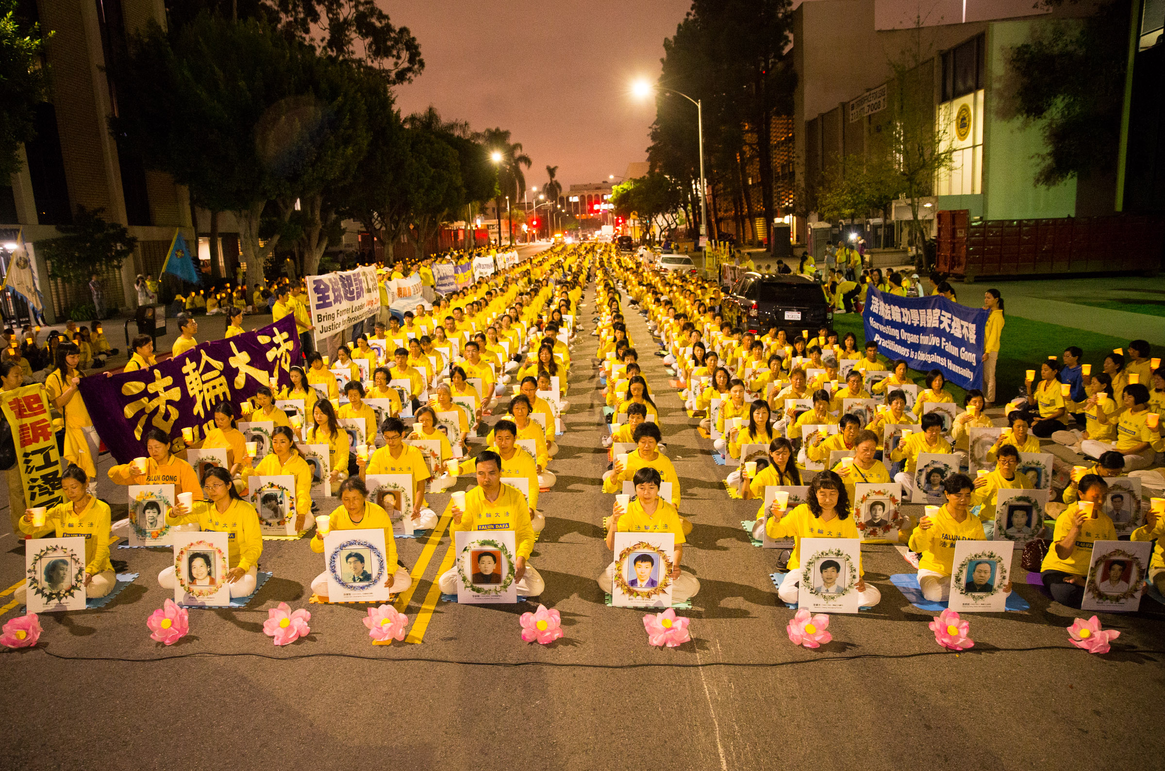 二零一五年十月十五日晚,洛杉矶中领馆两边的道路旁,一千多名来自世界各地的法轮功学员燃起蜡烛,静静端坐,悼念被中共迫害致死的中国大陆同修。点点烛光伴随,长长的队伍延伸了两个街区,庄严深沉的音乐声中,悼念致辞荡气回肠,仿佛天空为之动容,大地为之震撼。