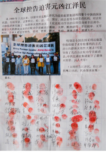 我说:“江泽民下令活体摘取法轮功学员的器官,牟取暴利,他犯的是‘反人类罪’和‘群体灭绝罪’,全世界有正义感的民众都在签名支持控告江泽民,你们也声援一下吧。”他们高兴地都一一签上了自己的真实姓名,也办了三退。