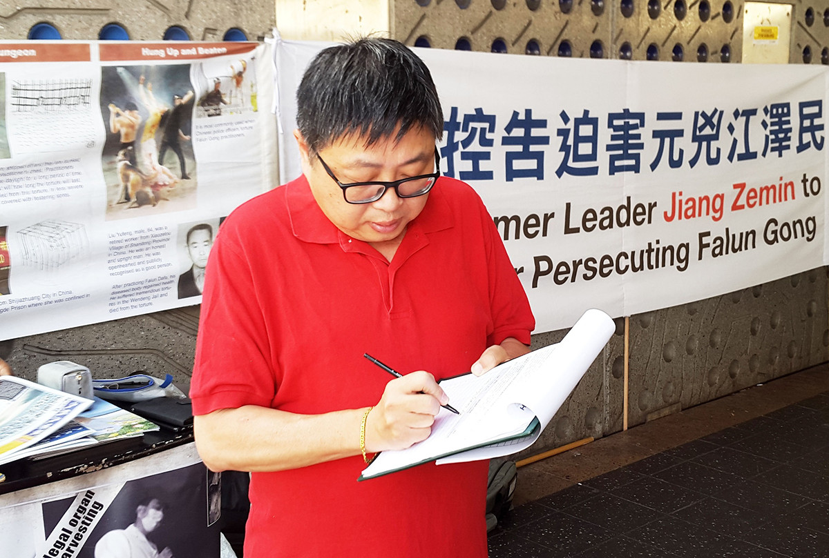 图1:帕拉马塔市议员约翰·胡正在签名声援中国法轮功学员控告迫害法轮功元凶江泽民