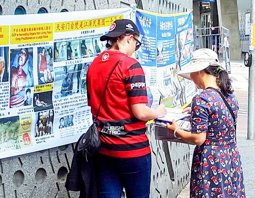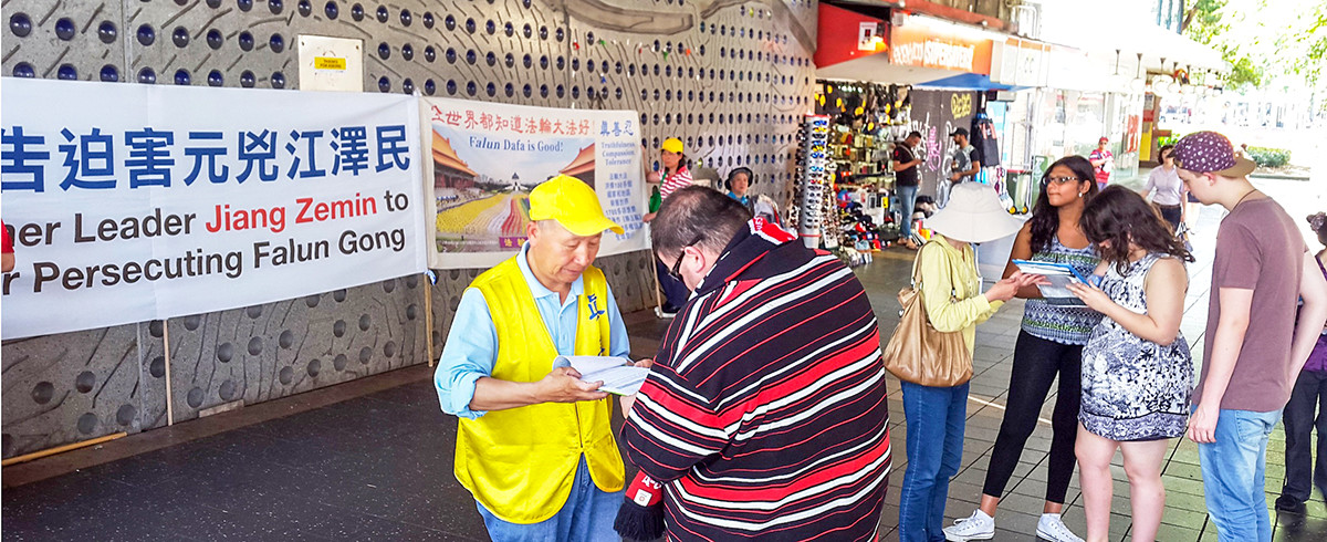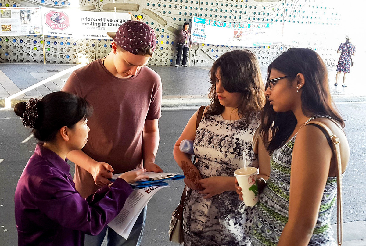 当天许多市民都驻足了解真相,特别是在周末的国际连锁大商场韦斯特菲尔德(Westfield)对面展示真相,许多平时上学和上班族的人都在进出商场前来到真相摊位前观看并进一步了解真相,很多人在声援中国法轮功学员控告迫害法轮功元凶江泽民的征签表上签了名表示支持和主动传播真相。