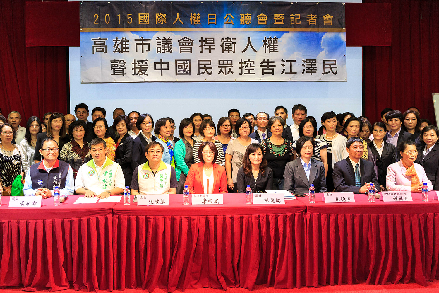 十二月一日在高雄市议会举办“二零一五国际人权日公听会暨记者会”声援中国民众控告江泽民公听会,并邀请法轮功人权律师及控告江泽民的台湾法轮功学员谈受迫害经历。为支持该人权提案,议长康裕成及多位议员出席这次公听会。