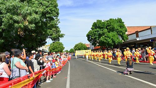 由悉尼法轮大法学员组成的身着黄色传统服饰的腰鼓队和古装仙女队在游行队伍中显得格外亮丽和多姿多彩。她们踏着整齐的舞步随着“法轮大法好”的音乐、喜气洋洋的挥舞着鼓槌,敲击出令人振奋的嘹亮鼓声,受到沿途众多民众的热烈欢迎。当地报社摄影师也跟随拍摄了法轮功腰鼓队在游行中的表演。很多第一次看到中国传统文化美好的澳洲人更是对法轮功游行队伍赞不绝口,Sheran和她的朋友都表示:中国腰鼓队非常优雅、美丽,我们第一次亲眼目睹,真喜欢。