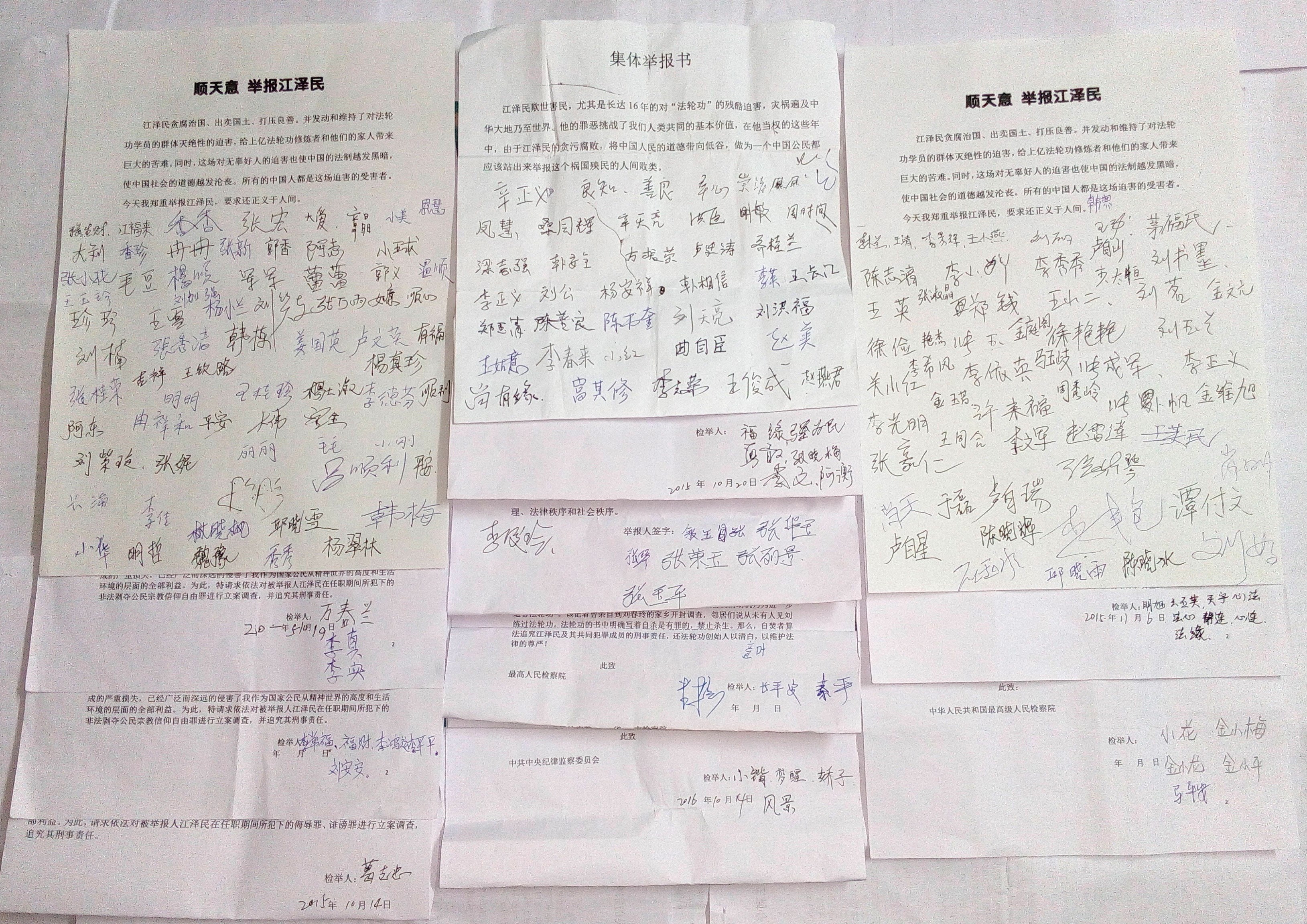 举报江泽民迫害法轮功信件一份,57人签名; 声援起诉江泽民签名表三张,164人签名