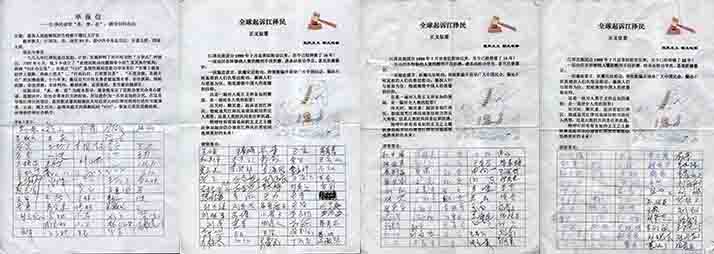 过程中,曾出现很多感人的场面:有的一家一家签名。有一建筑工地民工集体签名,人们纷纷斥责江泽民:“没干过好事!”“早就该把他抓起来,他给中国人丢尽了脸!”“等审判他的时候,我们要多买点鞭炮!”