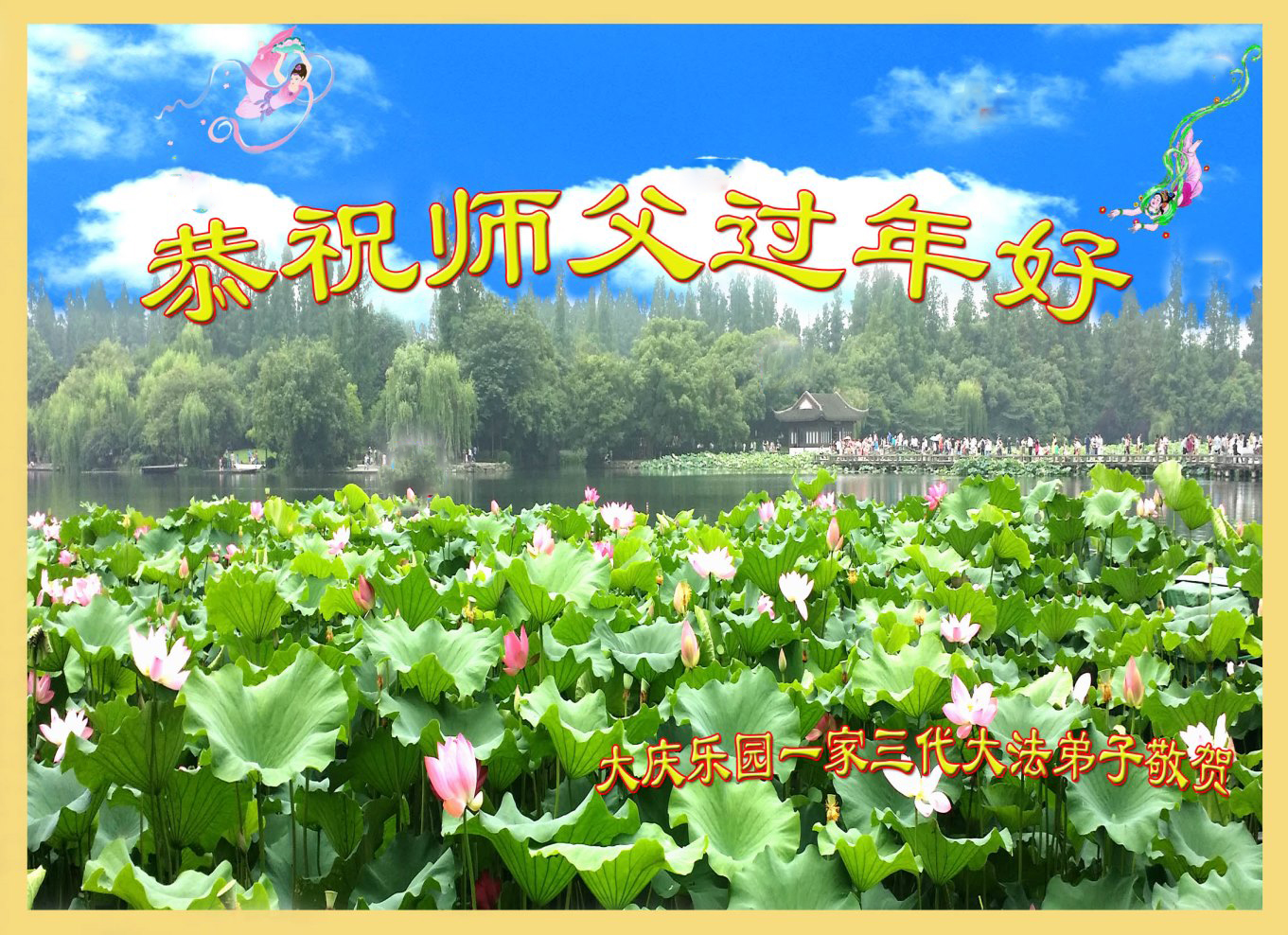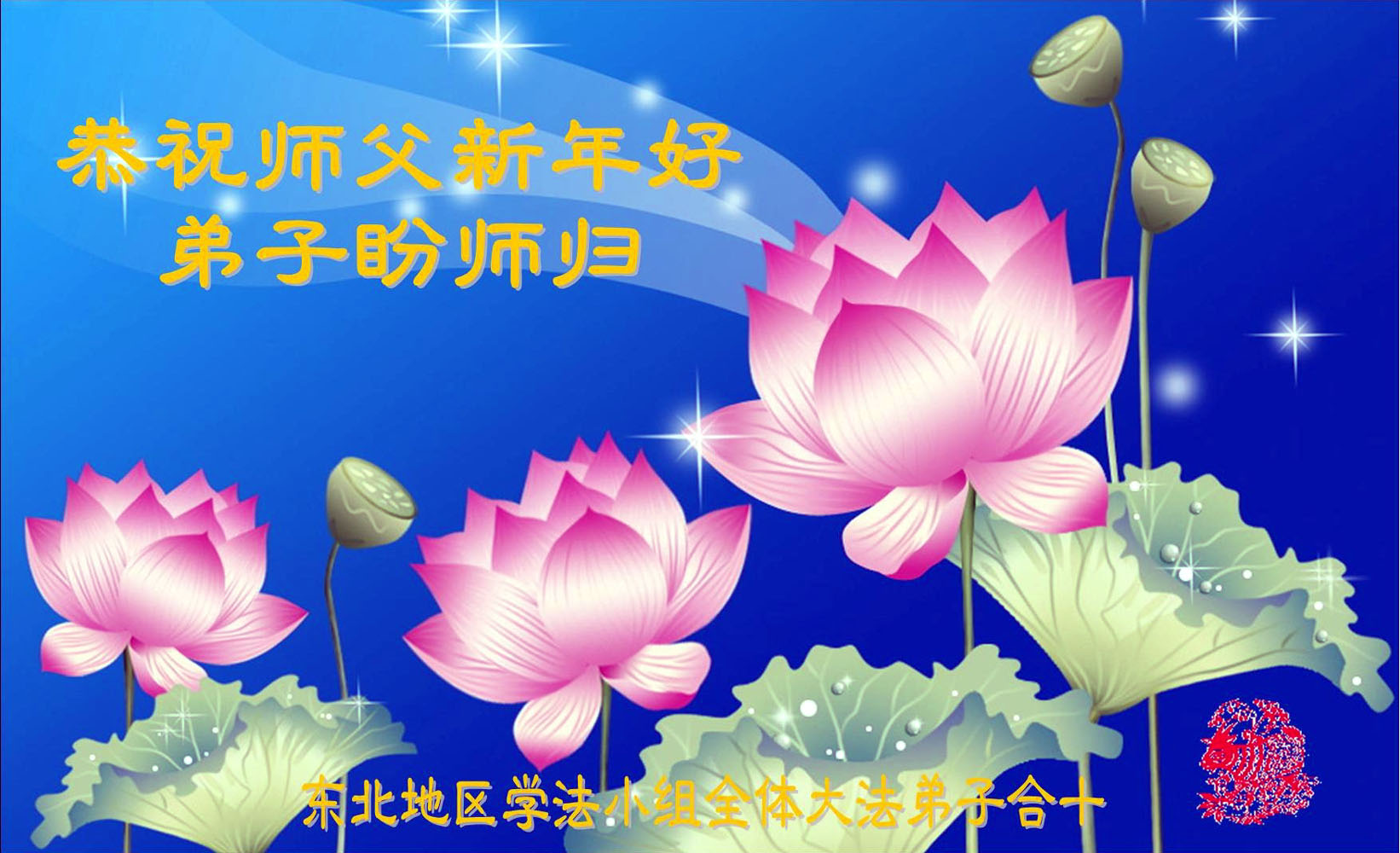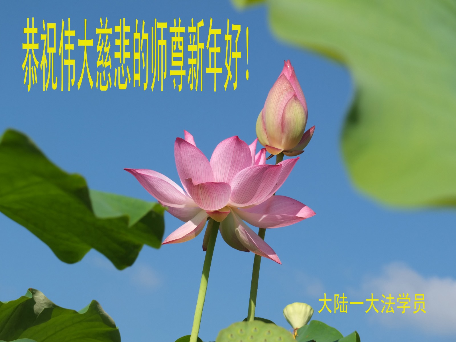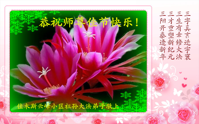 一元复始,万象更新。在新的一年里,弟子们一定谨记师尊教诲,向内找、向内修,决不辜负师尊的慈悲救度。努力做好三件事,跟上正法進程,多救人,回报师恩。盼与师尊早日团聚。给师尊拜年!