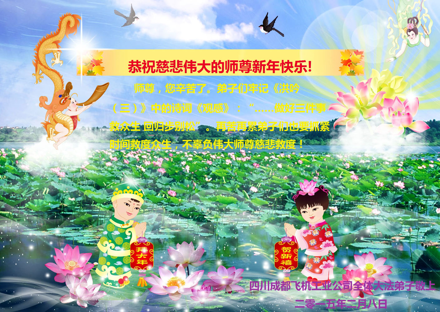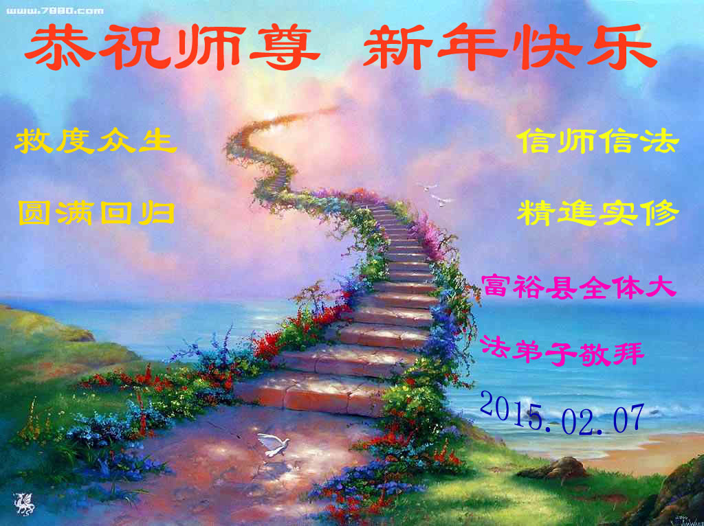 值此二零一五年中国新年即将来临之际,中国大陆铁路系统全体大法弟子恭祝至尊至上慈悲伟大的师尊新年快乐!感谢师尊对我们的慈悲苦度!在师尊的慈悲呵护与加持下我们逐渐走向成熟,弟子们所拥有的一切都溶汇着师尊巨大的付出与承受,对师尊的感恩无以言表。我们只有珍惜这万古机缘,珍惜这所剩不多的助师正法时间,增强凝聚力,整体圆容配合,做好三件事,救度更多的世人,满载众生随师还。