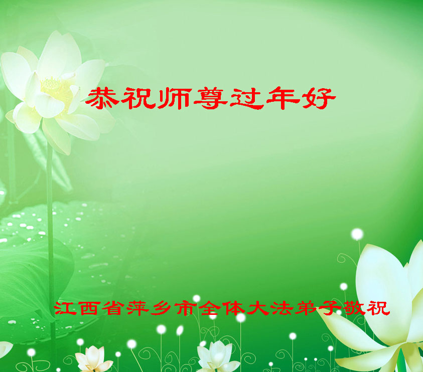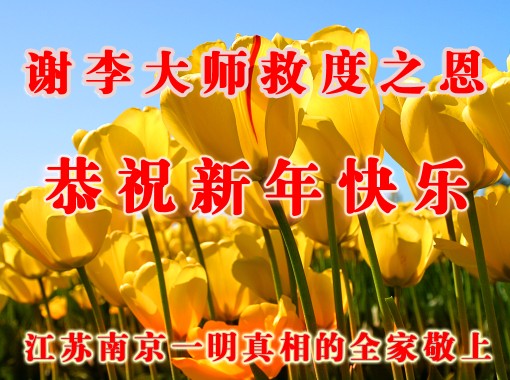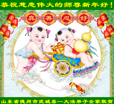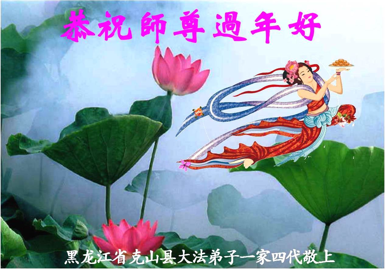 我们全家人在此给师父拜年!诚心恭贺李大师新年快乐!承蒙大师的浩荡佛恩,福泽苍生,我们全家人都受益无穷,生活美满幸福。感谢大师的大恩大德!感谢大师无微不至的护佑!“法轮大法好!真善忍好!李大师好!”这是我们每天必念诵的宝典,也是我们幸福的源泉。我们十分支持家中的大法修炼人,您的弟子都是好人、是大好人。感谢李大师!感谢法轮大法给人类带来了光明、带来了希望、带来了幸福!也衷心盼望大师早日回国,幸福大团圆。再次祝大师及您的家人新年快乐!