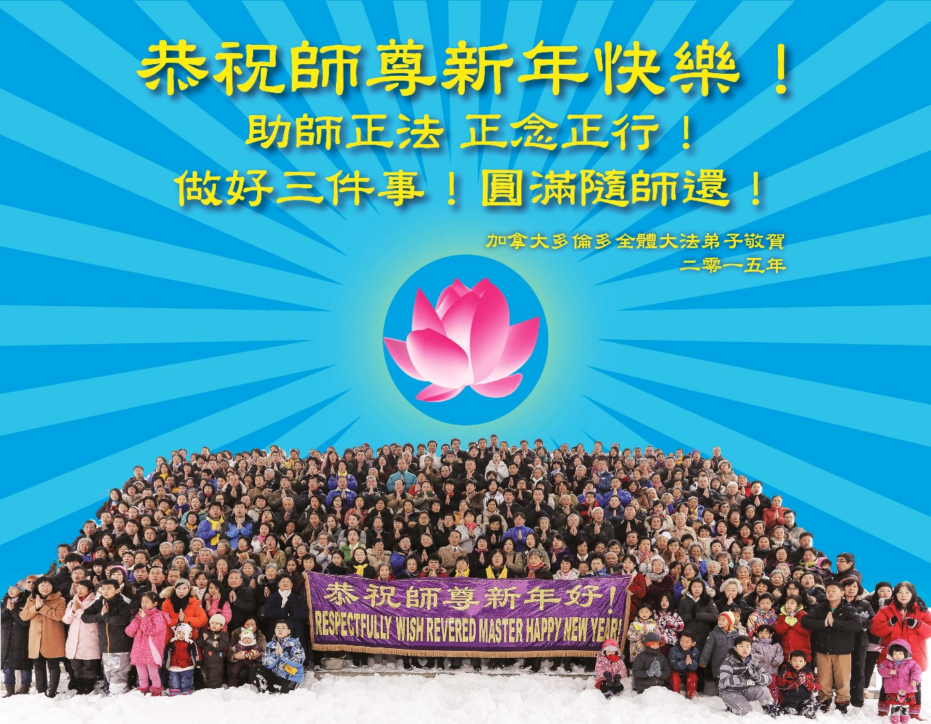 在二零一五年新年之际,我们小组全体大法弟子及明真相的亲人们向慈悲伟大的师尊恭贺新年,师尊过年好!