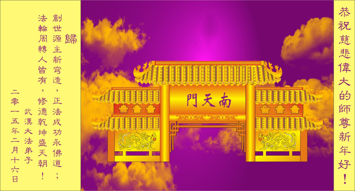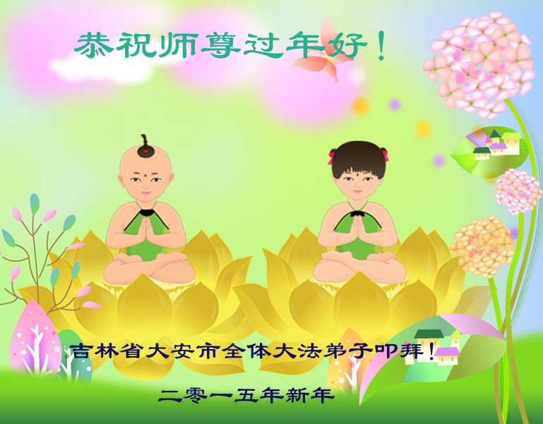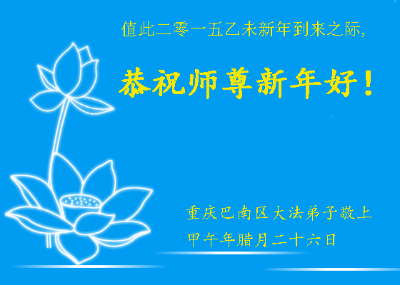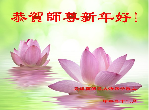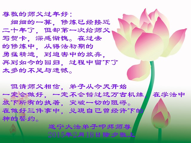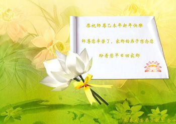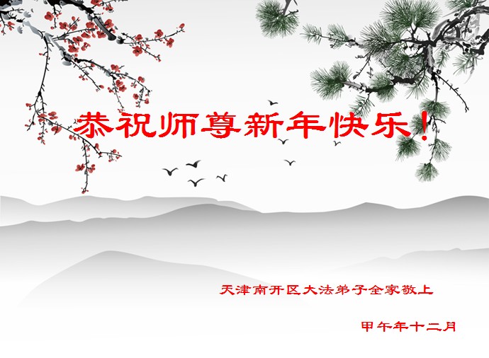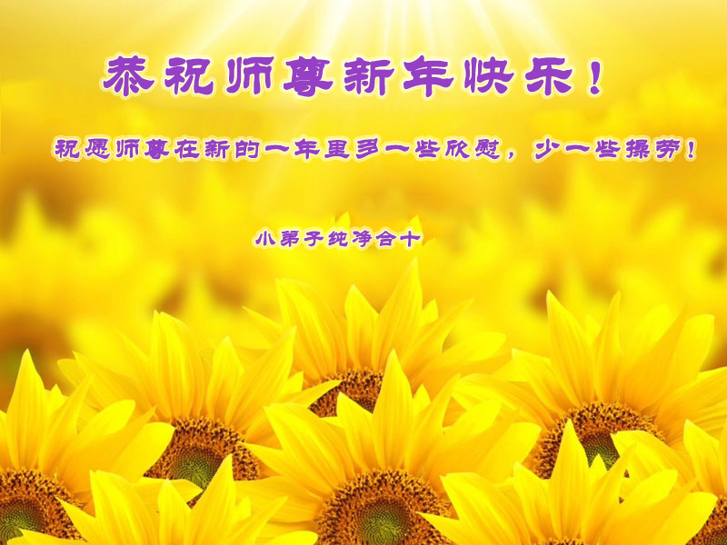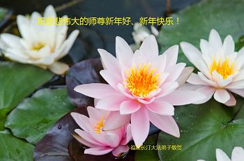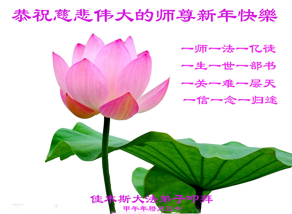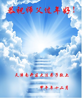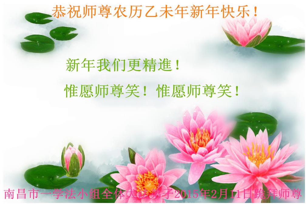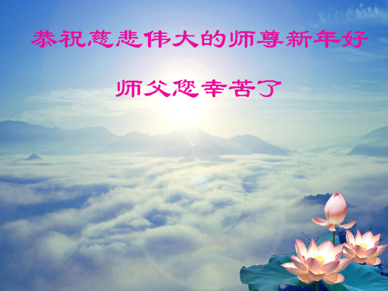 尊敬的师父您好!甲午年即将过去了,这一年我们没有白过,在师父的指导下,我们各方面都取得了一定的成绩。但是,与师父的要求相比还差的很远。我们决心在乙未年,更加听师父的话,加倍努力,克服松懈情绪,拿出得法初期的那股劲头,進一步按师父的要求做好三件事,兑现自己的誓约,救度更多的众生,早日圆满跟师父回家。请师父放心。跪拜师尊!