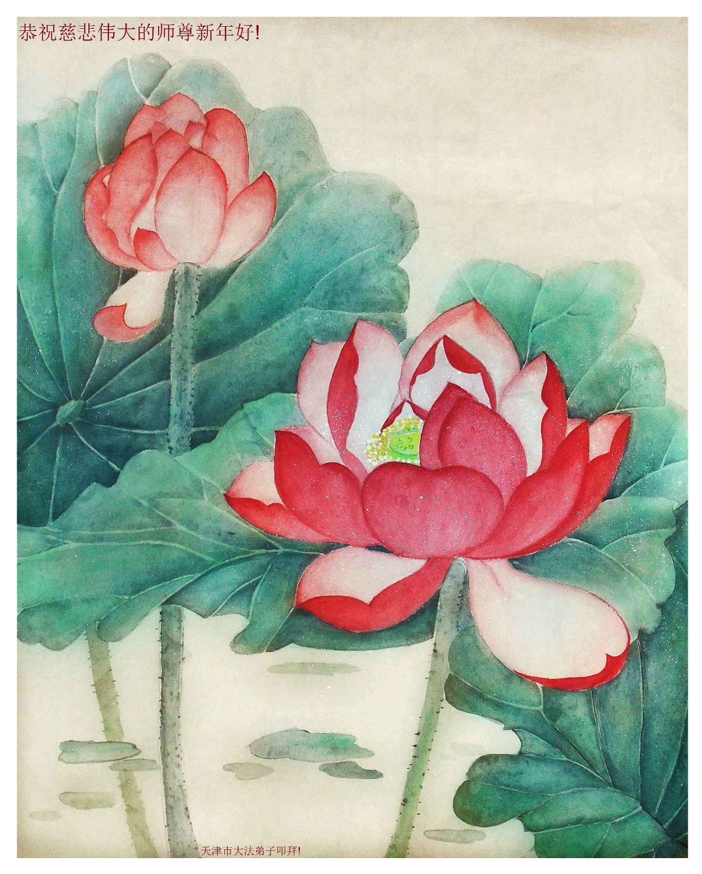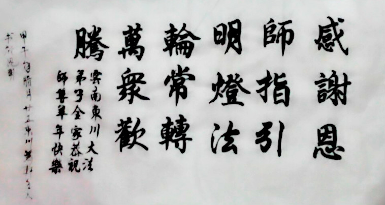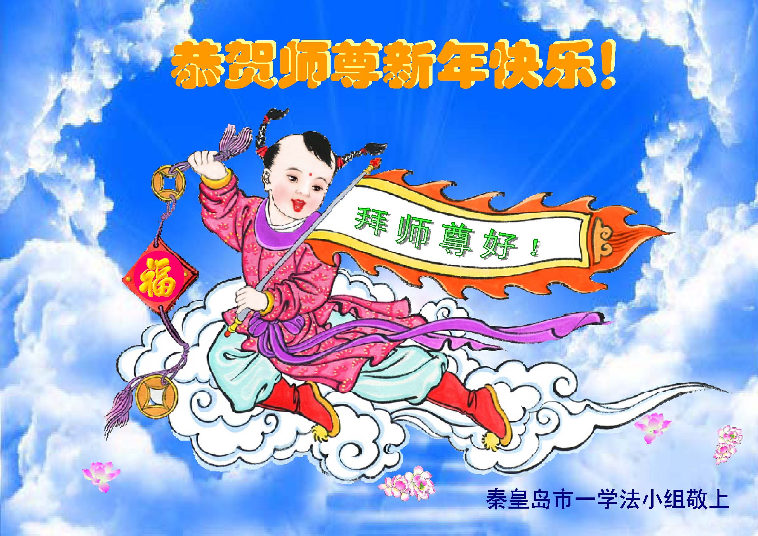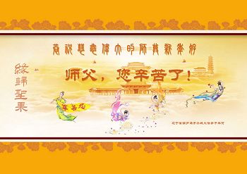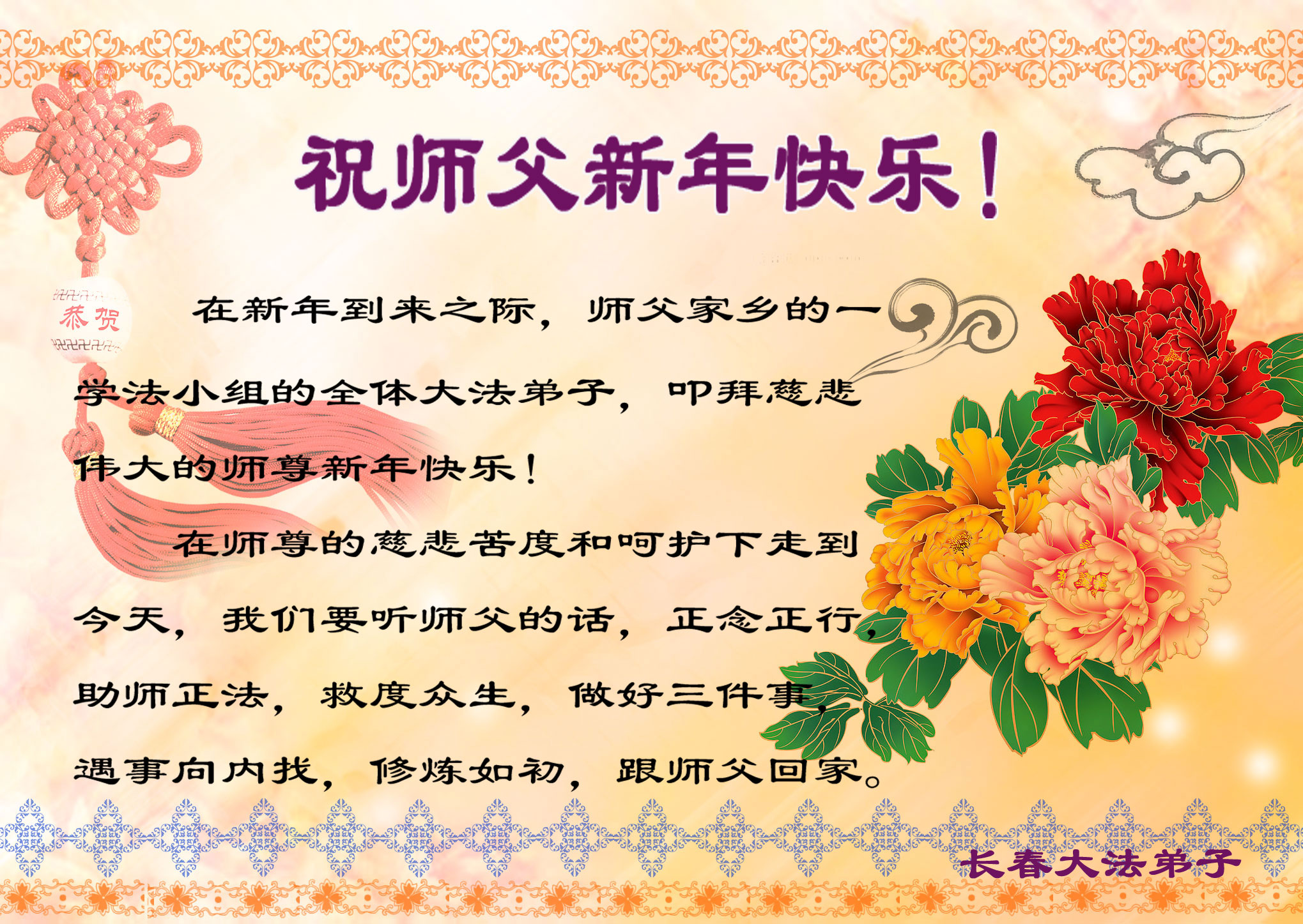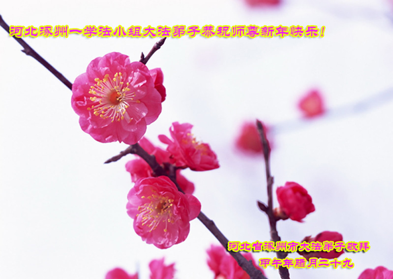 尊敬的师父您好!甲午年即将过去了,这一年我们没有白过,在师父的指导下,我们各方面都取得了一定的成绩。但是,与师父的要求相比还差的很远。我们决心在乙未年,更加听师父的话,加倍努力,克服松懈情绪,拿出得法初期的那股劲头,進一步按师父的要求做好三件事,兑现自己的誓约,救度更多的众生,早日圆满跟师父回家。请师父放心。跪拜师尊!