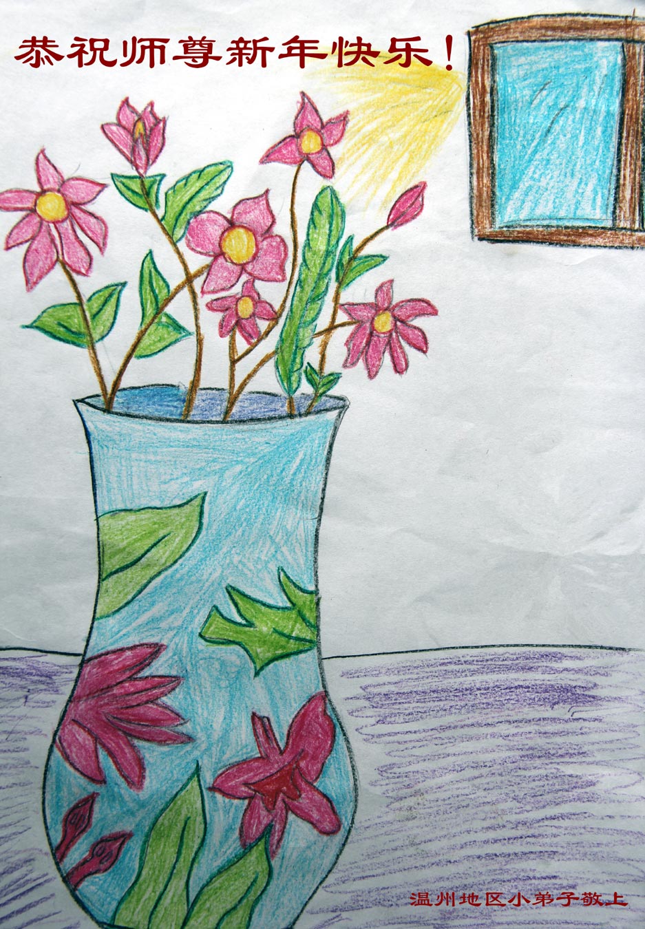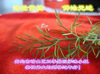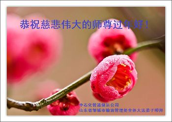 我今年79岁了,我以前因为胆小怕共产党的那一套整人的伎俩,不支持我的亲人炼法轮功, 后来在亲人的劝说下看了《九评共产党》、《神韵》、《未来人的神话故事》等等真相小册子之类,彻底明白了真相,我常念法轮大法好,身体更加健康,有时我还看看大法书籍,我昨天去买来鲜花给您敬上,又叫我外孙女帮我做成贺卡给您拜年! 谢谢李大师!