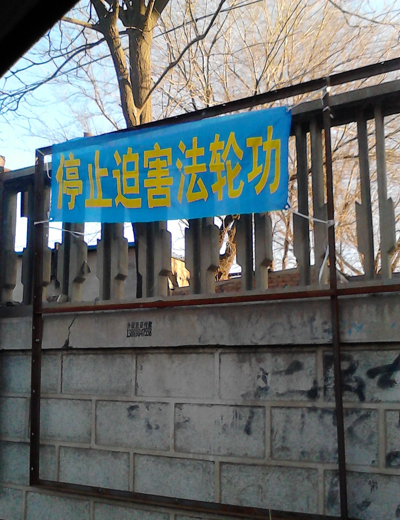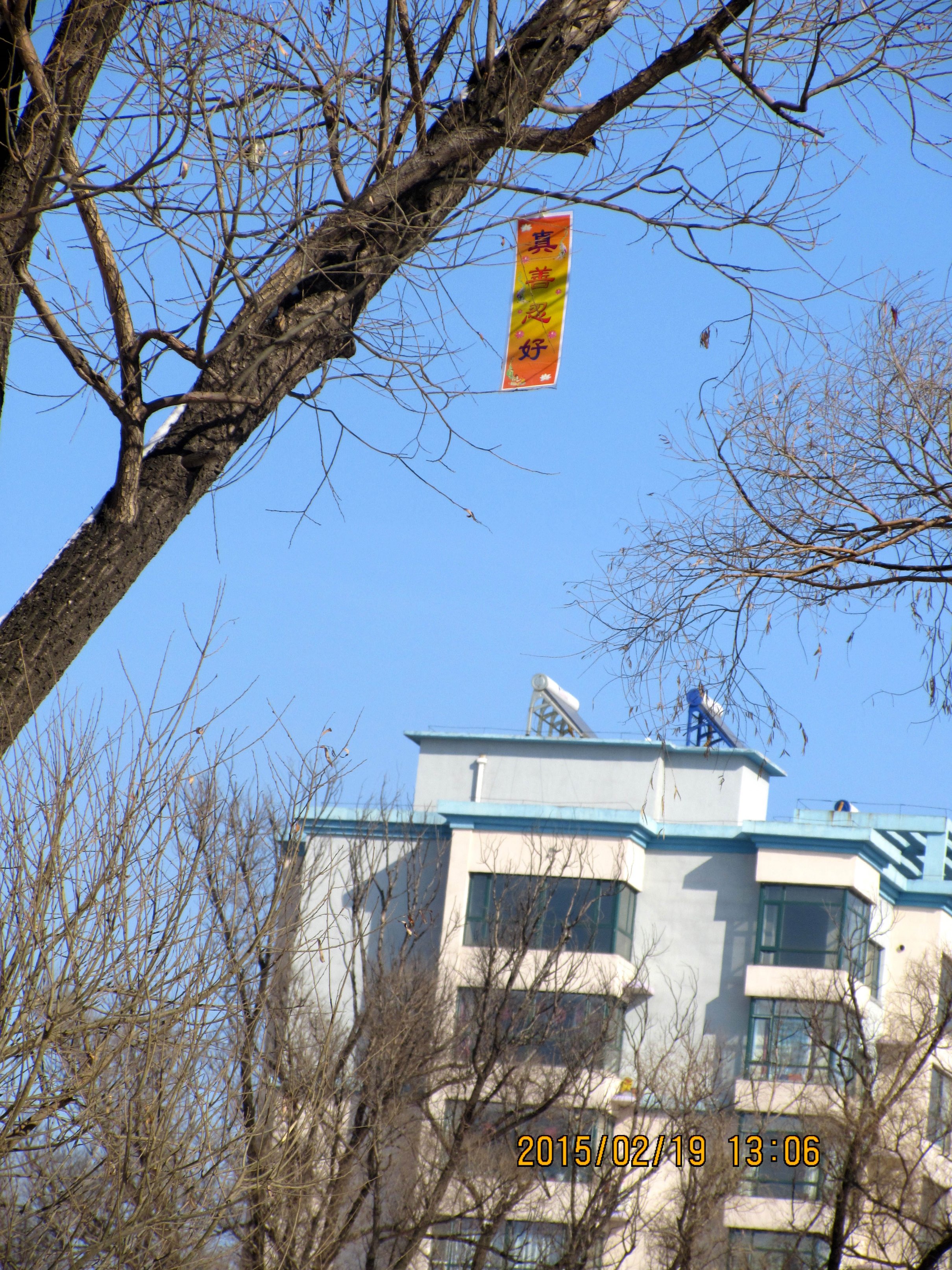 大年初一,吉林省某市法轮功学员悬挂真相条幅给人们送来春天的祝福过年期间,辽宁某市的真相条幅