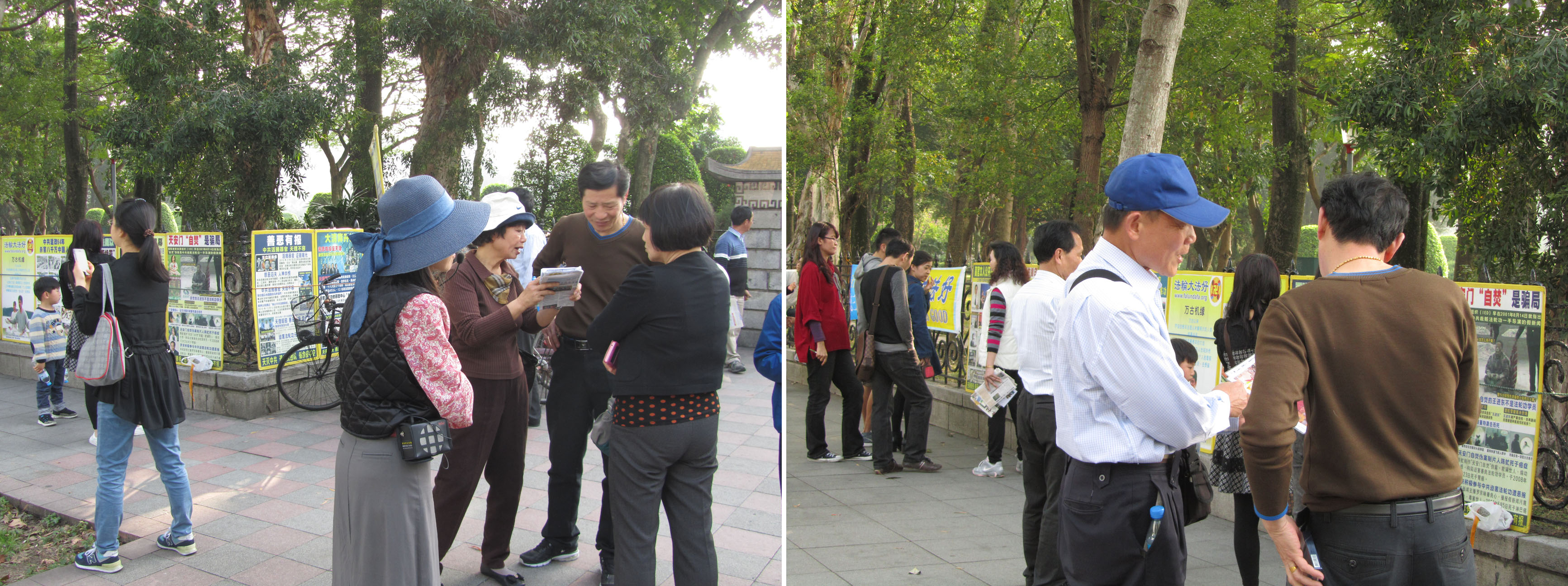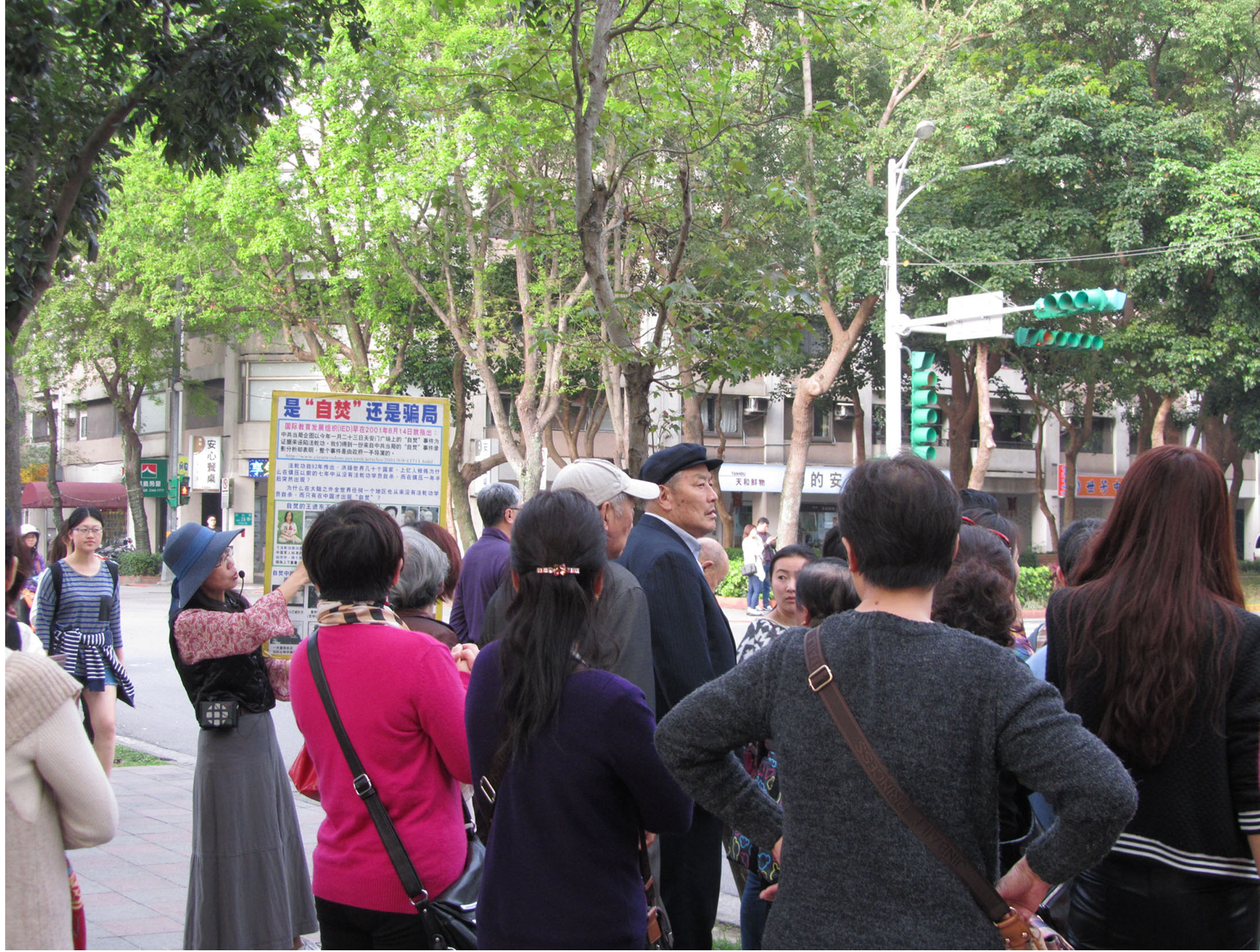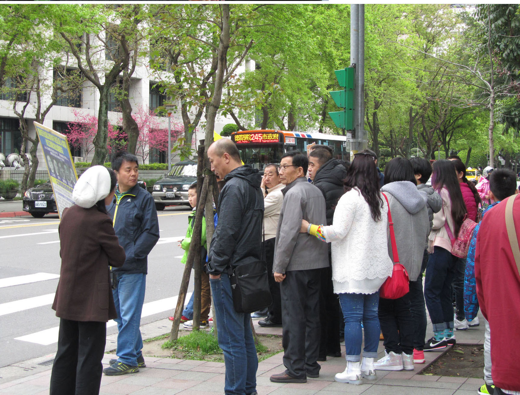 三月一日年初十,一位导游带着二十多位团员,等车时间,导游对举展板的法轮功学员说:“你说,你赶快跟他们说(真相)。”讲完真相后,学员对导游说:“他们来台这段期间可说是黄金假期,导游你让他们看真相、听真相、明白真相,让他们的生命有得救的机会,真的是做好事积功德。”导游高兴的点头说:“是,是!谢谢,谢谢!”