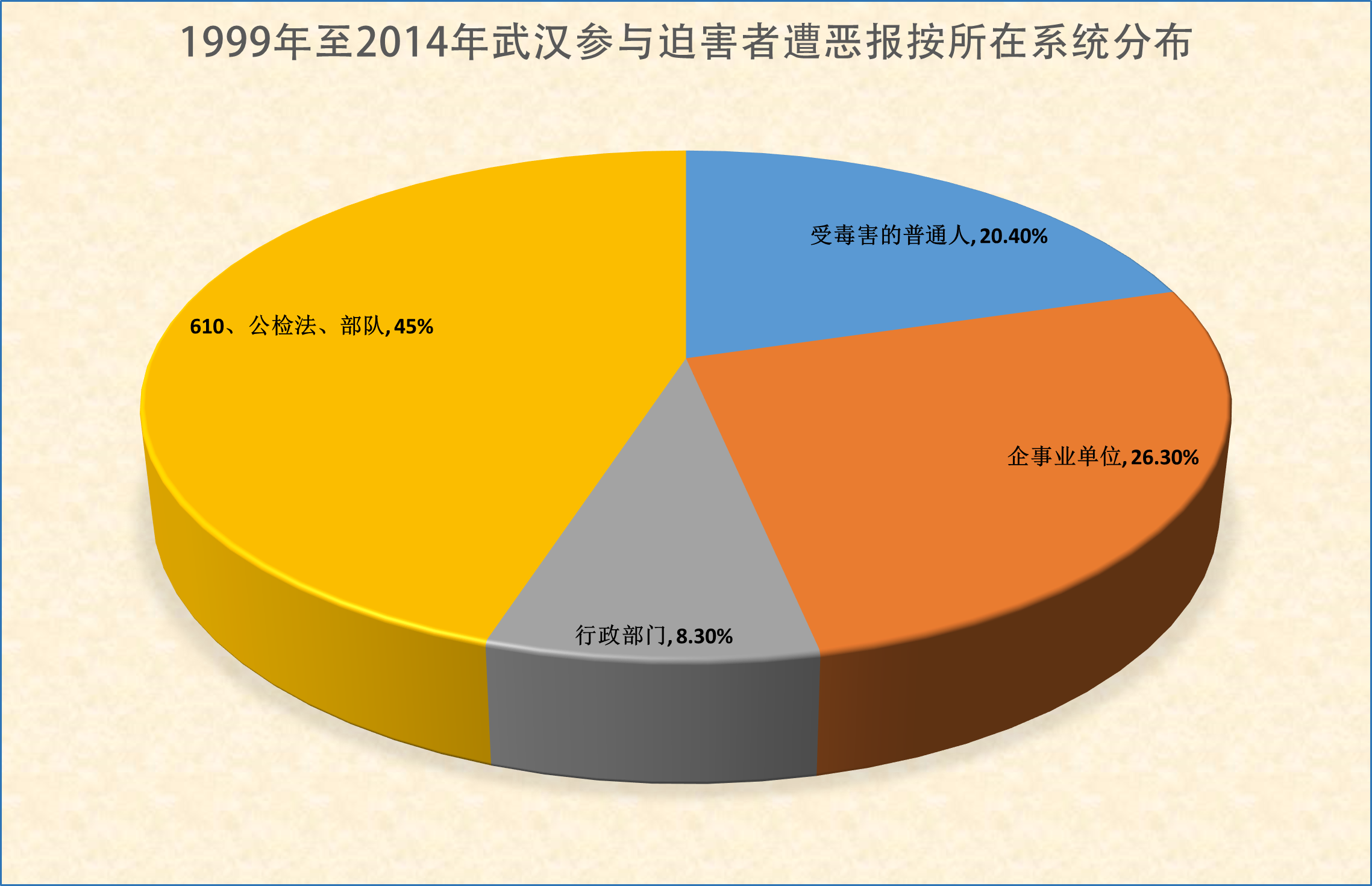 据明慧网公布的有关信息统计,从1999年起到2014年底,武汉各地因参与迫害法轮功而遭恶报案例至少338人,包括本人和祸及家人。由于中共迫害和严密封锁真相、恶报案例和实际比起来只不过是冰山一角。
