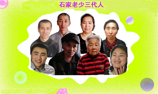后排左起:石孟文、大哥石孟昌、大嫂韩淑娟、大姐石秀英;前排左起:侄子石奇磊、父亲石殿立、母亲王庆荣、侄媳刘丽敏。