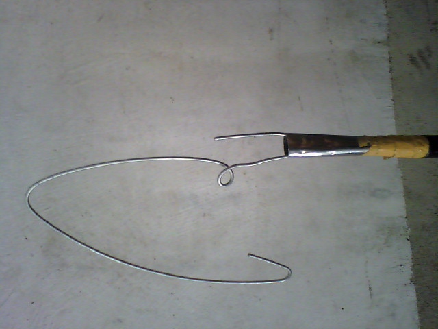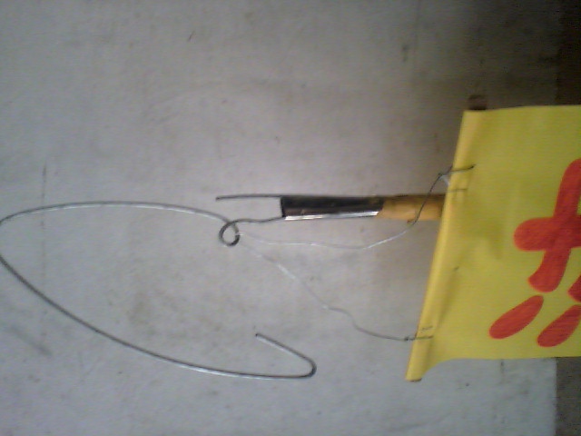 按照图片制作悬挂条幅,可以在非常短时间内悬挂条幅,特此投稿,希望推广此方法。图中主要是一个钓竿。悬挂方法用钓鱼竿将铁丝挂上后,把钓鱼竿向下一拉即可完成。悬挂时铁丝的一端朝上弯,可有效防止取下。