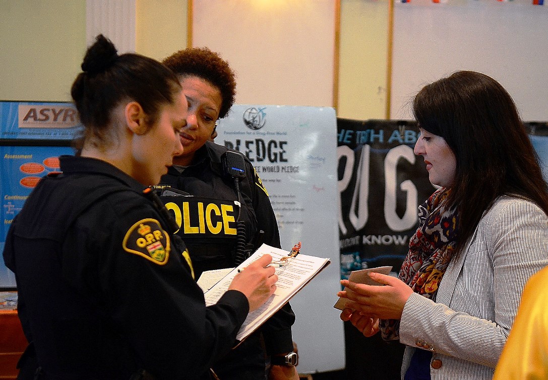 工作于Hate Crime Unit(仇恨犯罪部门)的警官Mark Topping来到法轮功展位听了学员Miriam的介绍后,他把自己的名片递给Miriam说:“我在执行任务中,我不能(在签名表上)签名。但在我的管辖范围内,包括整个加拿大,如果你或任何一个法轮功学员受到任何的伤害或威胁,马上打电话给我,我任何时候都可以提供帮助。”